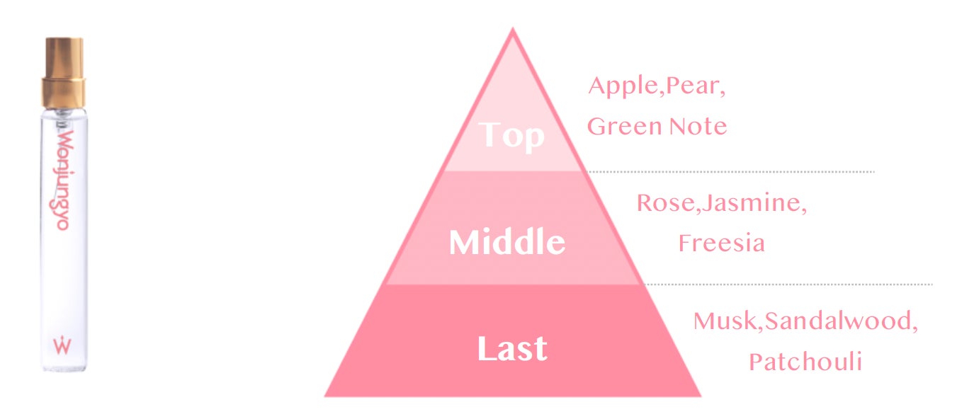 「Wonjungyo Hair」のモイストタイプと同じ、泡が弾けるシャンパンに、みずみずしさ溢れる洋梨を加えたような、心躍るフルーティーな香り。