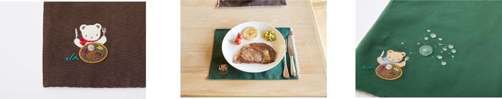 ファミリアのものづくりへのこだわりと、ひとつひとつにストーリーがある上品なデザインは、世代を超えて愛され続けています。第1弾に続き、兵庫県の農業や食にまつわる親子のコミュニケーション(食育)のきっかけになればという想いで、手軽に食卓に特別感を演出することができる「ランチョンマット」を作りました。アート部分には、初めての「神戸ビーフ」のステーキにワクワクしているクマちゃん。ステーキに添えられた野菜は、第1弾の「レジかごバッグ」のアートで、クマちゃんと女の子が収穫してきたたまねぎ・トマト・とうもろこし・枝豆。