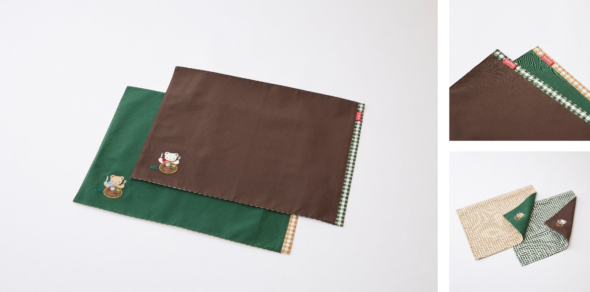 ランチョンマットは緑色と茶色の2色で1組。第1弾同様に、農業・農産物・JAを連想する緑色と、あらゆる農畜産物を育む土の茶色をメインカラーとし、ファミリアでは珍しい配色です。表面右側と裏面にも緑色・茶色のギンガムチェックを組み合わせているのもポイントです。