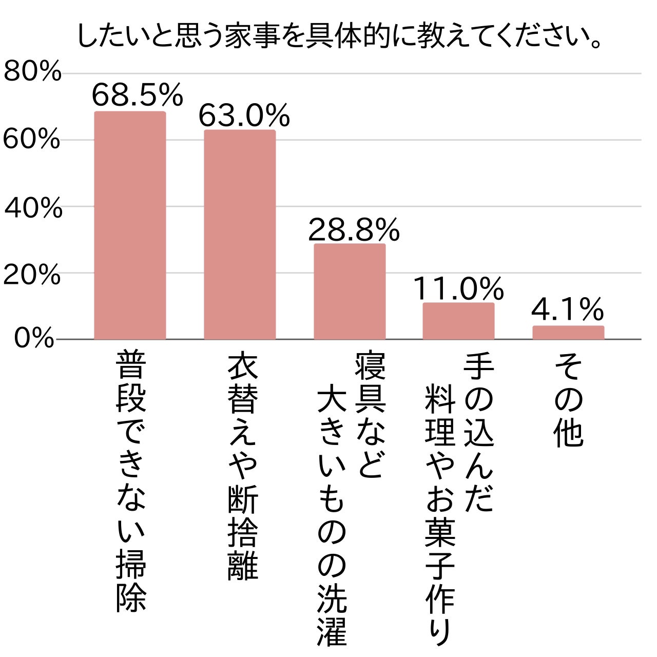 また、「寝具など大きいものの洗濯」(関東28.8%・全国37.7%)や、「手の込んだ料理やお菓子作り」(関東11.0%・全国17.7%)がしたいという意見もありました。