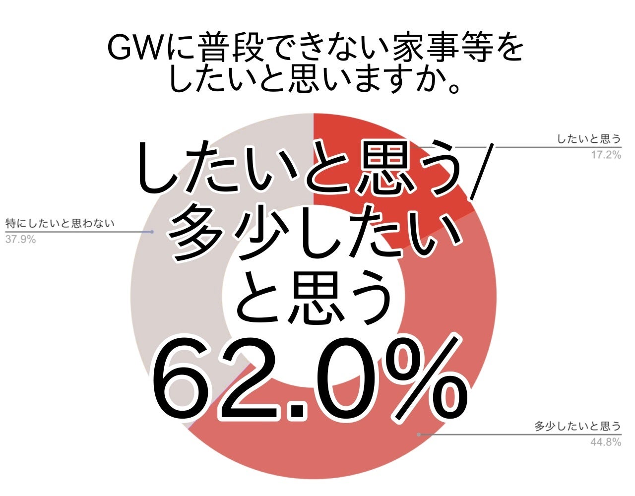 アンケートでは、(GWに休みが取れない方を除く)回答者全体を対象に、GWに普段できない家事等をしたいと思うか尋ねました。