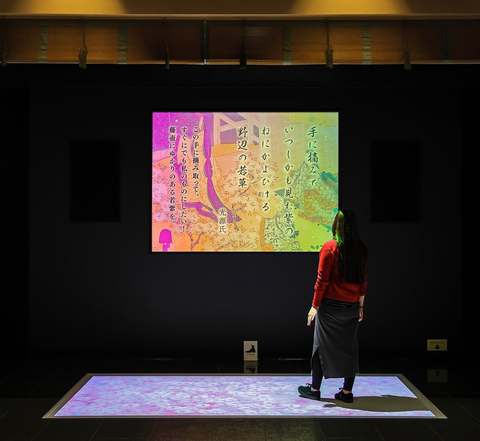 デジタルコンテンツ「四季之間」では、ゲーム感覚で『源氏物語』の世界に触れることができます。足下に広がる花の映像から源氏物語にちなんだイラストを探し当てると、源氏物語の名シーンが和歌とともに壁に映し出されます。現在の映像は3種類ですが、8月9日からはさらに増えて5種類に!