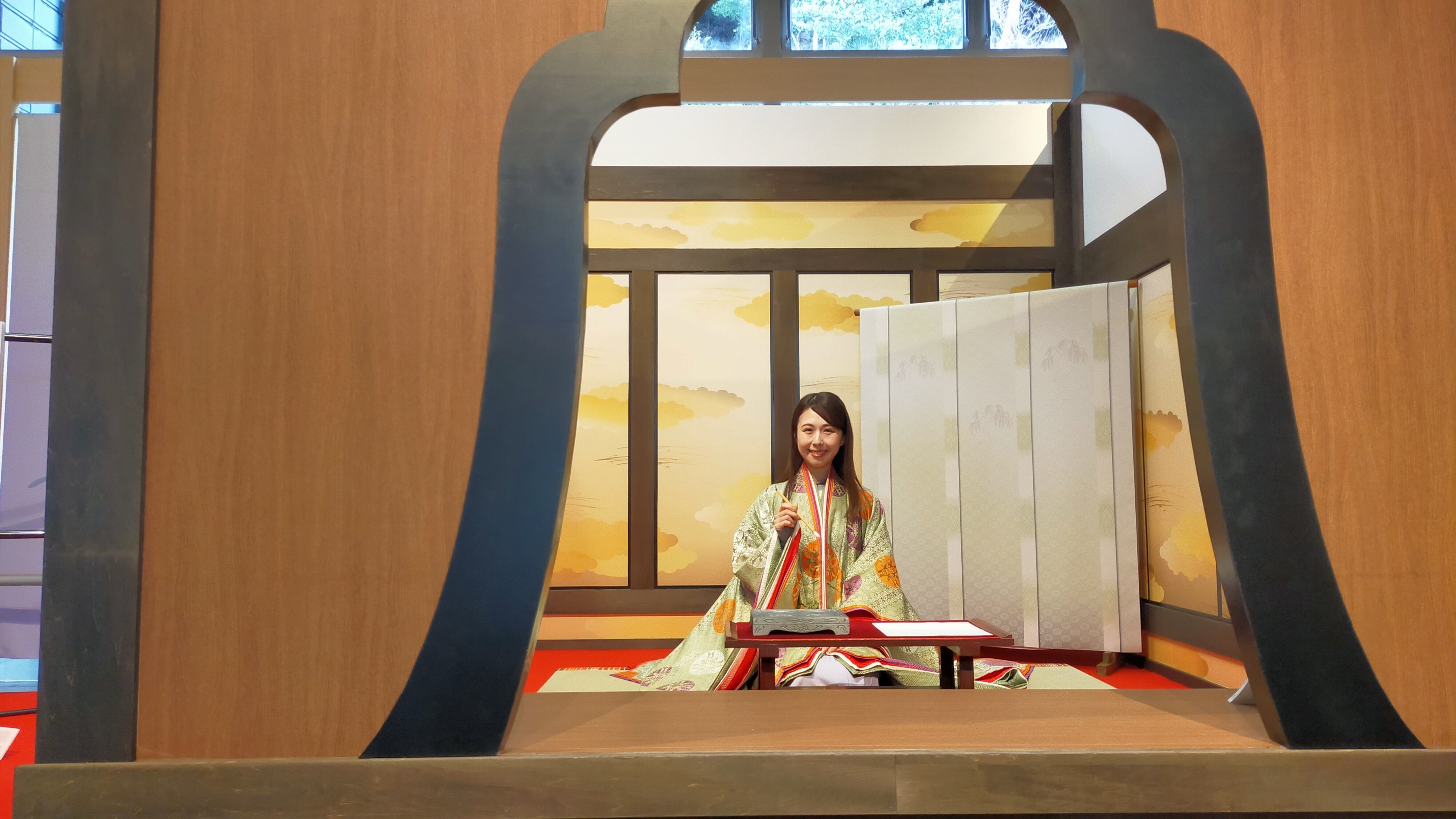 このフォトスポットは、紫式部が源氏物語の構想を練ったと伝わる石山寺の「源氏の間」を再現したもの。