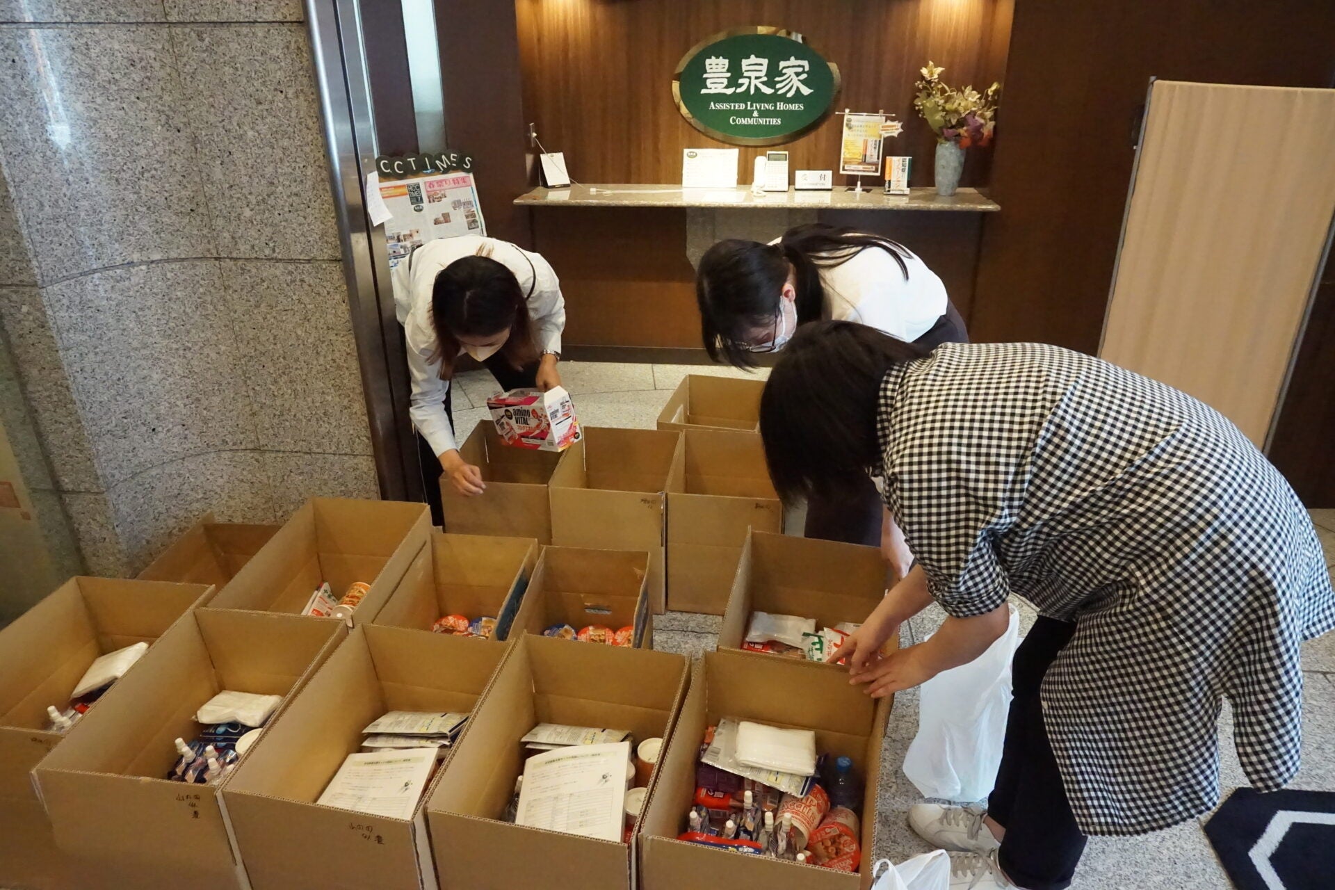 予防・医療・介護の豊泉家グループ(大阪府・兵庫県)。豊泉家グループでは、新型コロナウイルス感染症の影響があった職員やその家族に対し食料品や感染予防グッズなどの支援物資配給を独自に実施しています。