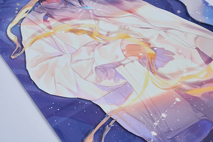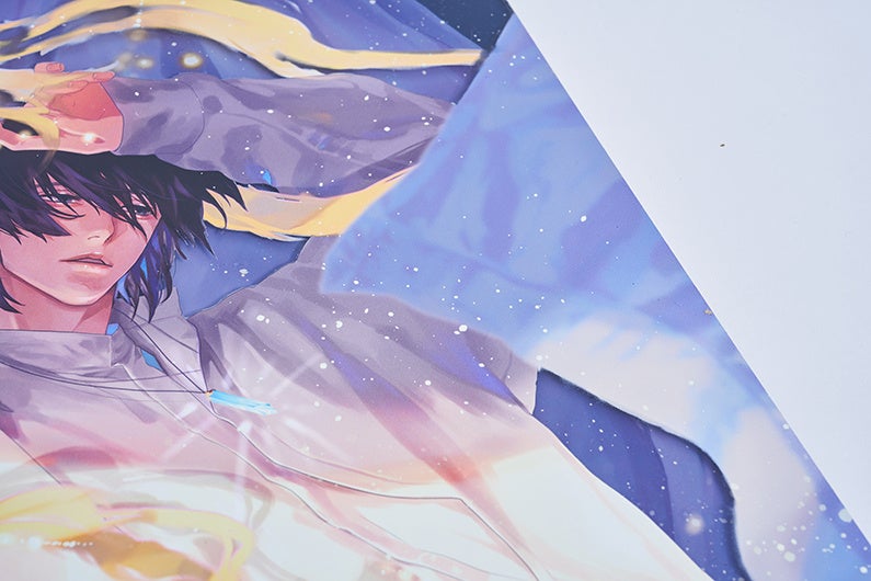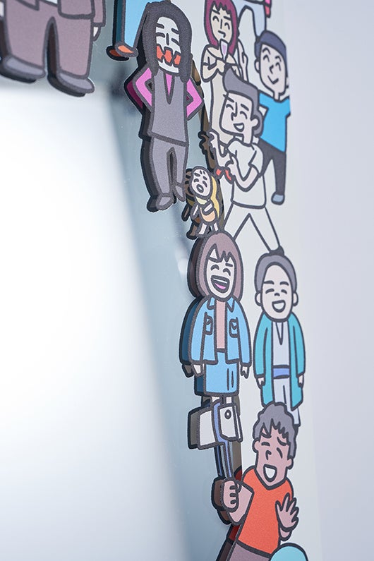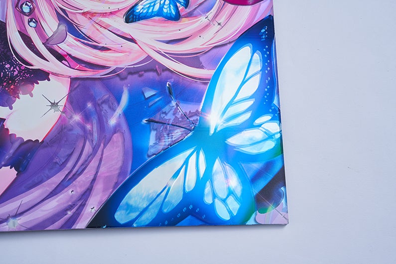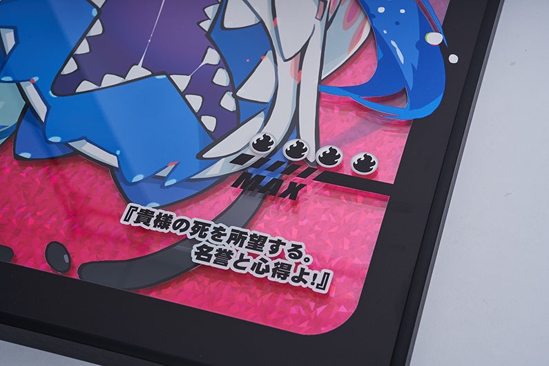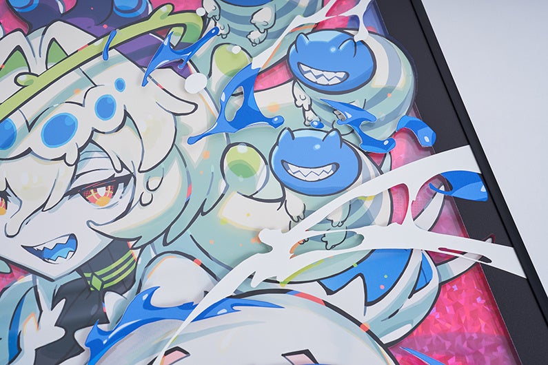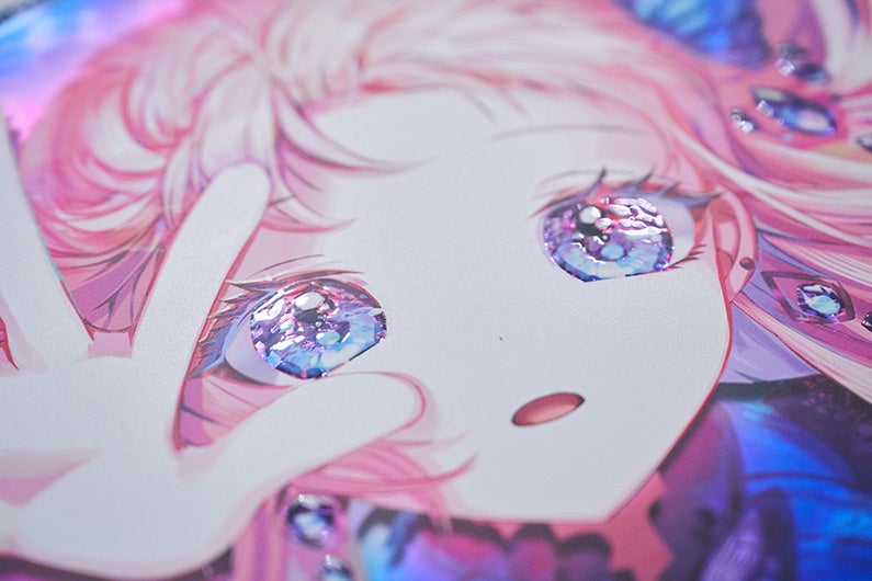 各イラストにはFlat labo社による特殊印刷を用い、イラストのモチーフの手触りを再現した展示や、アクリルパネルによるカードゲーム風のキラカードを模した展示、表裏印刷を活かし見る角度によって印象が大きく変化する展示等、作品性に沿って趣向を凝らしています。