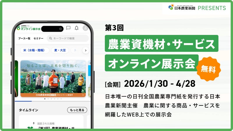 株式会社日本農業新聞(本社:東京都台東区、代表取締役社長:田宮和史郎) 主催の「第3回 農業資機材・サービス オンライン展示会」が本日開幕しました。