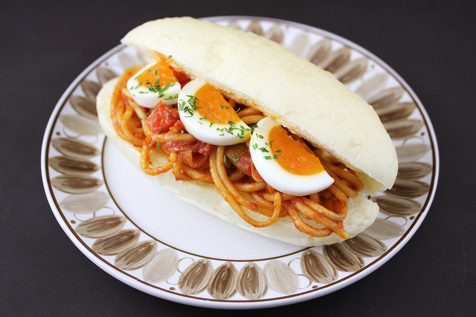 ふんわりとしたパンに、ナポリタンスパゲッティと半熟風たまごをサンドしました。シンプルなふわふわのパンと、ケチャップのよく効いたナポリタンは喫茶店を思わせる味わいです。