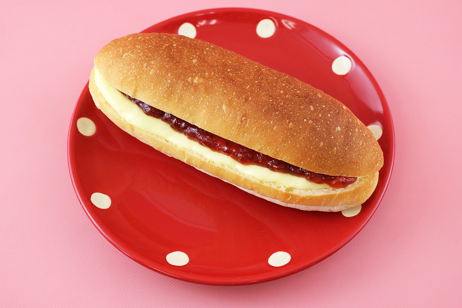 コッペパンにいちごジャムとマーガリンをサンドしました。どこか懐かしみを感じるコッペパンと、いちごジャムにマーガリンの組み合わせは王道で外さない美味しさです。