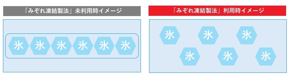 「みぞれ凍結製法」を用いない場合、氷が一枚岩のように固まり、ほぐしづらくすぐに食べられないという課題がありました。水分子を分散させ凍結する技術により、氷を割りほぐしやすくシャリシャリとした食感を楽しめます。