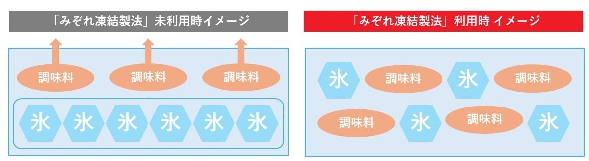 調味料全体が均一に凍結、溶解する技術により、味の濃い部分から先に溶け出したり、味の薄い氷が残る心配は不要。味のムラなく、おいしくお召し上がりいただけます。