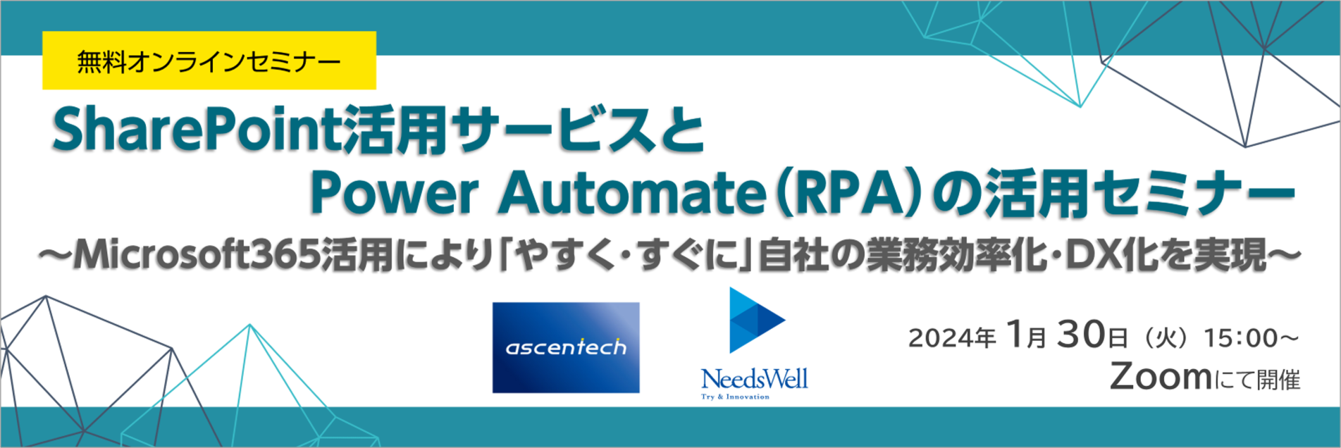 多くの企業の業務効率化・DX化を行ってきたニーズウェルと、多くのクラウド・バックアップソリューションを持つアセンテックが、「SharePoint活用サービスとPower Automate(RPA)の活用セミナー ~Microsoft365活用により「やすく・すぐに」自社の業務効率化・DX化を実現~」と題し、企業がもつ課題や不安を解決します!