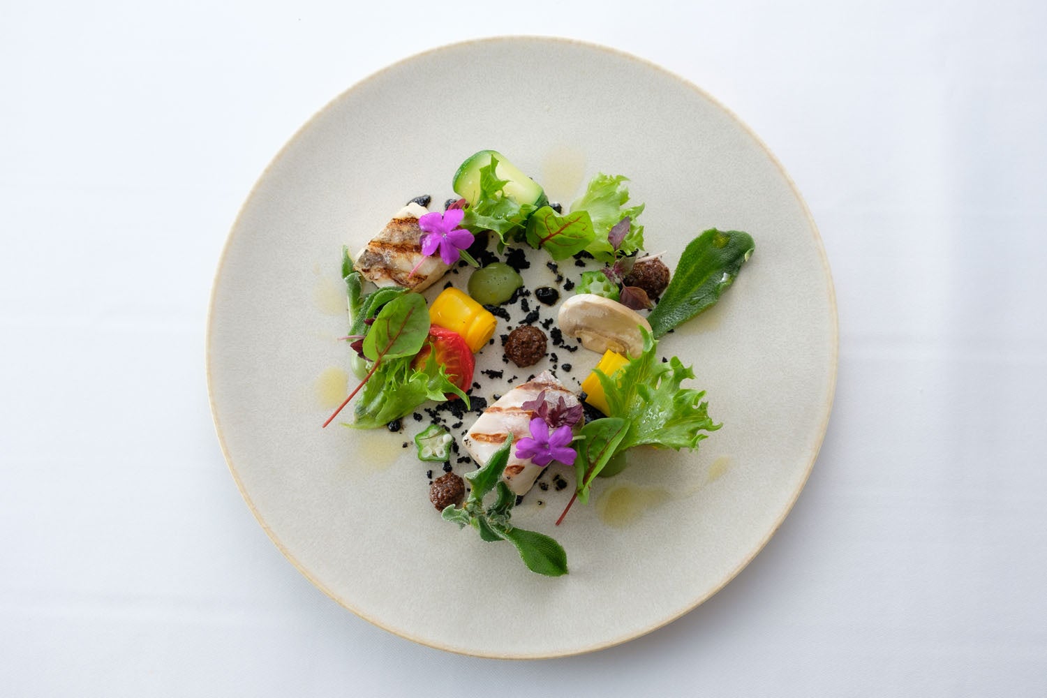 鹿児島県産のかんぱちを初夏の野菜が華やかに彩ります。大葉の香りと黒オリーブの深い味わいが、かんぱちの旨味を引き立てる一皿。