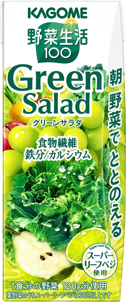 「野菜生活100 グリーンサラダ」は、野菜不足になりがちな朝を緑野菜と果実の美味しさで応援する野菜果実ミックス飲料です。スーパーリーフベジ※1である“プチヴェール”を配合し、グリーンサラダの栄養素(食物繊維・鉄分・カルシウム)を摂ることができます。1食分の野菜120g分※2を使用しています。爽やかな白ぶどうのおいしさと洋なしの豊かな香りに加え、ライムを使用することで後味スッキリの味わいに仕上げました。