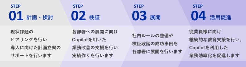 お客様の導入状況に合わせて、Copilotの効率的な導入検証、社内展開をご支援いたします。