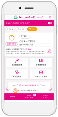 秋田県三種町に採用された『みっしゅるーむ』は、スマートフォン・タブレット端末・PCに対応したサービスで、妊産婦と子どもの健康データの記録・管理や予防接種のスケジュール管理、出産・育児に関するアドバイスの提供、離れた地域に住む祖父母など家族との共有機能や、町が配信する地域の情報をお知らせするなど、育児や仕事に忙しい母親や父親を助けてくれる便利な機能が充実しています。