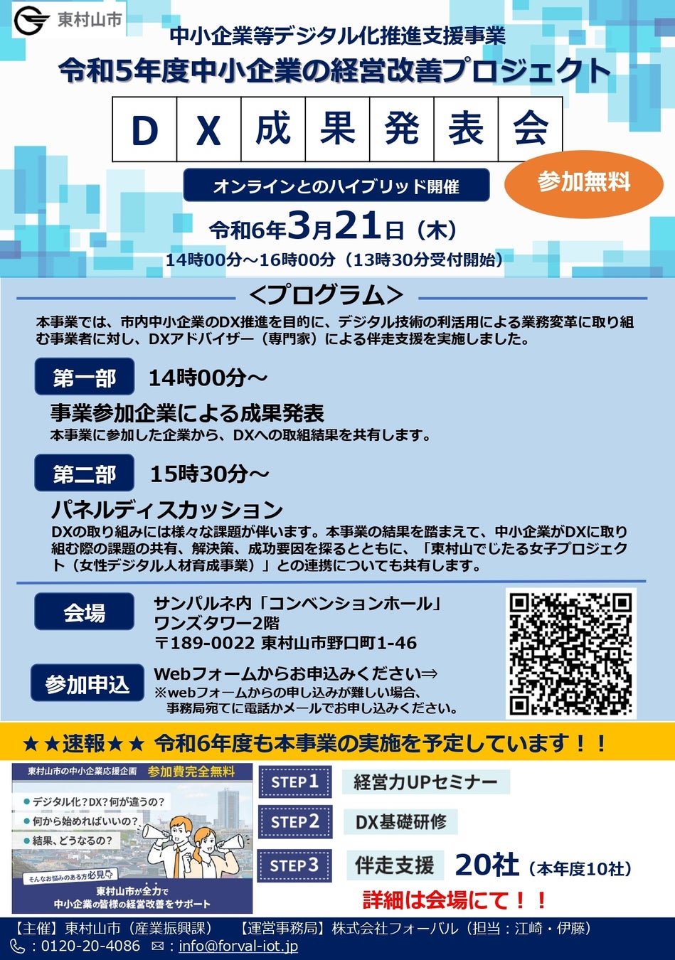 『「新しいあたりまえ」で、新しい世界を創る FORVAL 』を理念に掲げる、次世代経営コンサルタント集団 株式会社フォーバル(本社:東京都渋谷区、代表取締役社長・中島 將典、以下「フォーバル」)は2024年3月21日(木)に東村山市で開催される『令和5年度中小企業の経営改善プロジェクトDX成果発表会』の運営事務局を務めることをお知らせいたします。