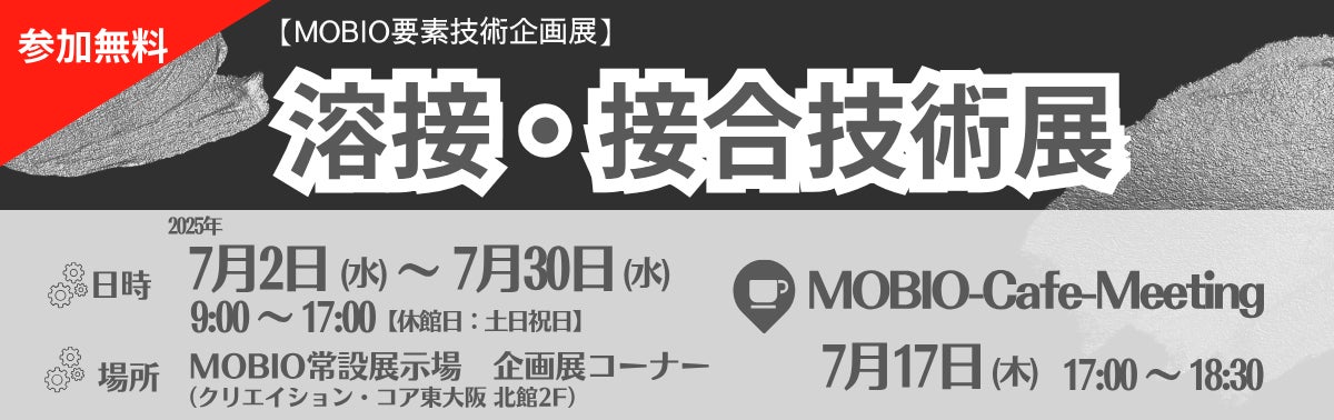 7月2日(水)~7月30日(水)、溶接・接合技術を持つものづくり企業18社がMOBIOに出展!大阪府内でレベルが高く注目されている溶接・接合技術が勢揃いする展示イベントを開催します。