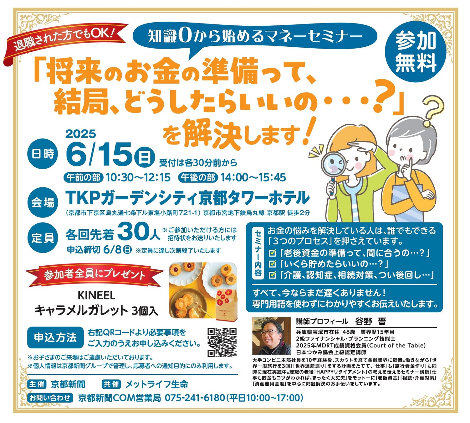 【京都新聞主催】退職した方でもOK!知識0から始めるマネーセミナー6月15日開催