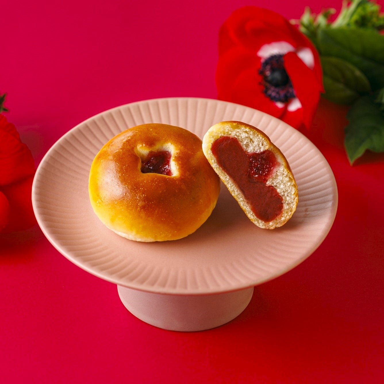 木いちごのパウダー、ジャム、さらにチーズクリームを加えた、甘酸っぱくもまろやかな味わいの木いちご餡を木村屋伝統の酒種生地で包みました。甘酸っぱい木いちごジャムをトッピング