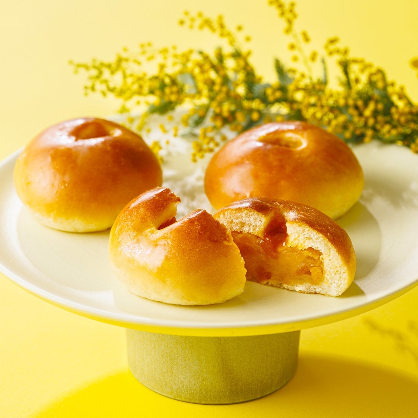 2種類のあんずで味わい深く食感を楽しめるあんず餡を、木村屋伝統の酒種生地で包みました。みずみずしいあんずジャムをトッピング。