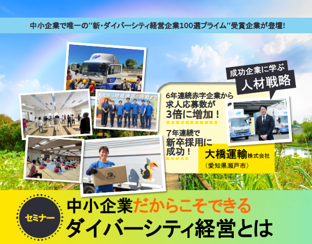仙台市では、地域企業の経営層・人事担当者の皆様向けに、中小企業が抱える人材の課題解決のためのヒントとなる、「多様な人材の活躍=ダイバーシティ経営」の第一歩を考えるセミナーを開催いたします。中小企業で唯一の経済産業省「新・ダイバーシティ経営企業100選プライム」選定企業である大橋運輸株式会社の鍋嶋洋行代表取締役社長を講師にお招きし、人材運用の悩みを解決し、企業成長へ繋げる実践的なヒントを伺います。