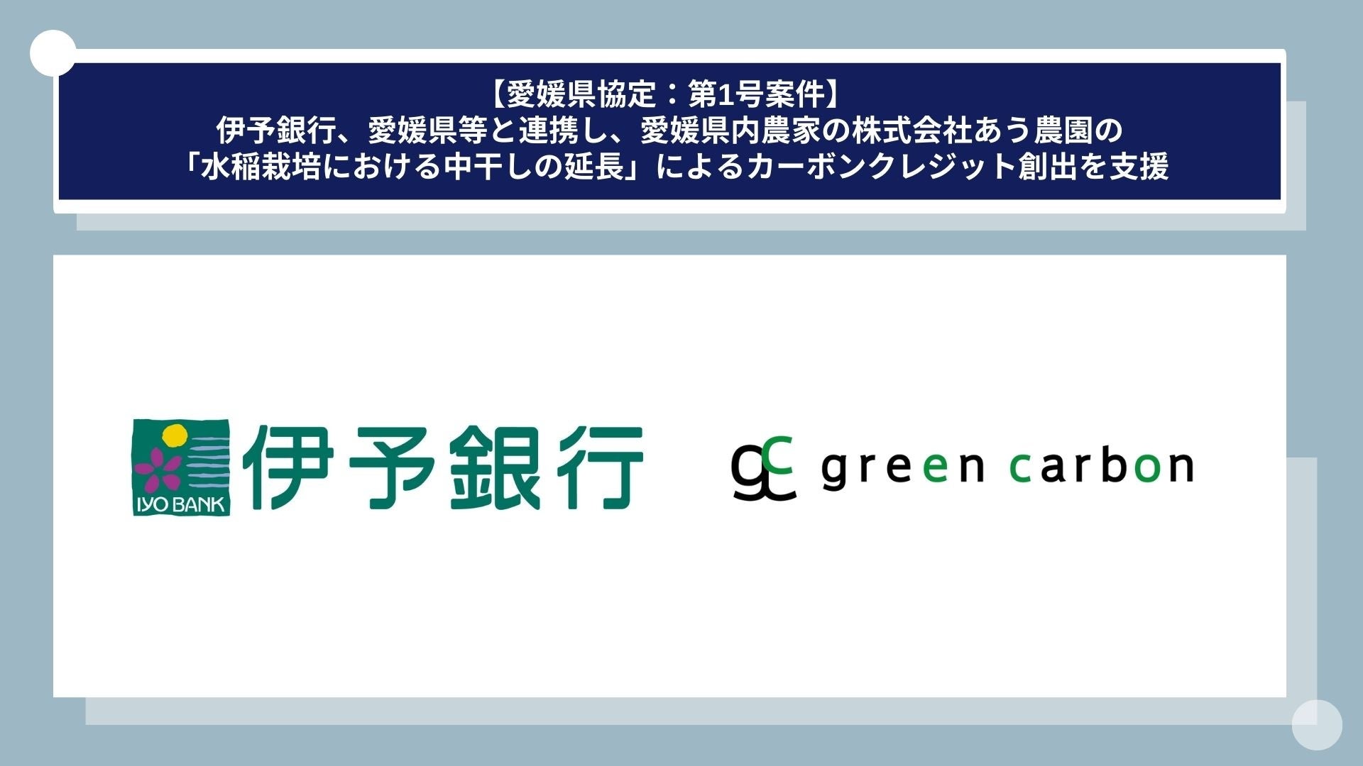 ネイチャーベースのカーボンクレジット創出販売事業を展開するGreen Carbon株式会社(代表取締役:大北潤、以下「Green Carbon(読み;グリーンカーボン)」)、株式会社伊予銀行(本社:愛媛県松山市、取締役頭取:三好 賢治、以下「伊予銀行」)、愛媛県等と連携し、愛媛県内水田農家の株式会社あう農園(代表取締役社長:有田 豊史、以下「あう農園」)の「水稲栽培における中干し期間の延長」によるカーボンクレジット創出支援を開始したことをお知らせします。