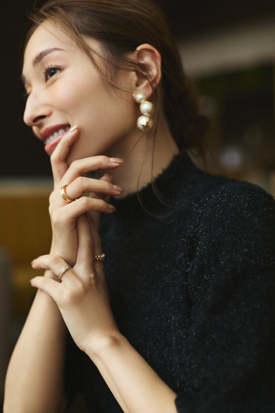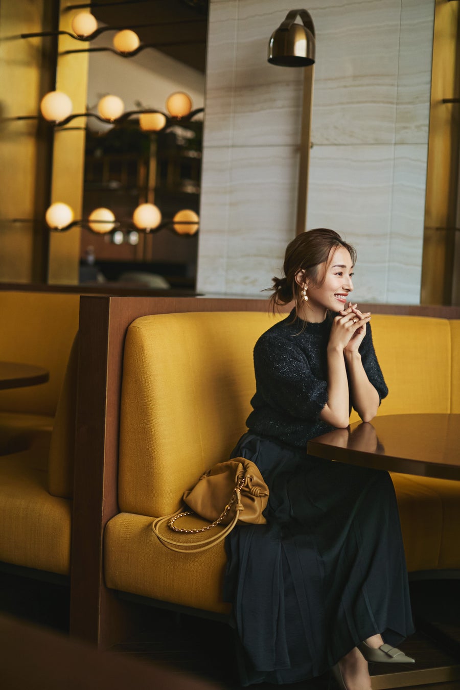 ホリデーのディナーなので、ラメ入りのブラックニットで上品な輝きも。」(吉田さん)