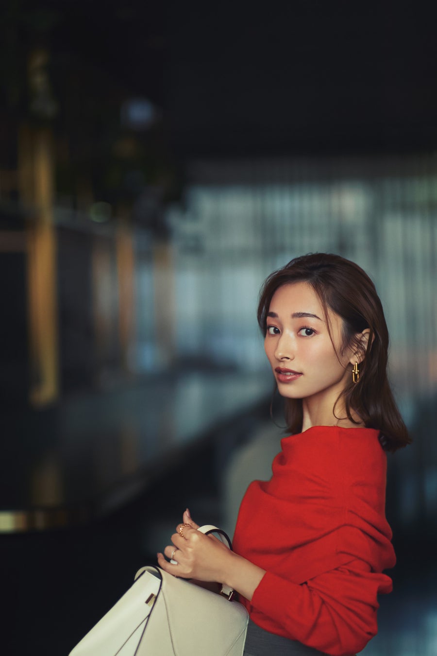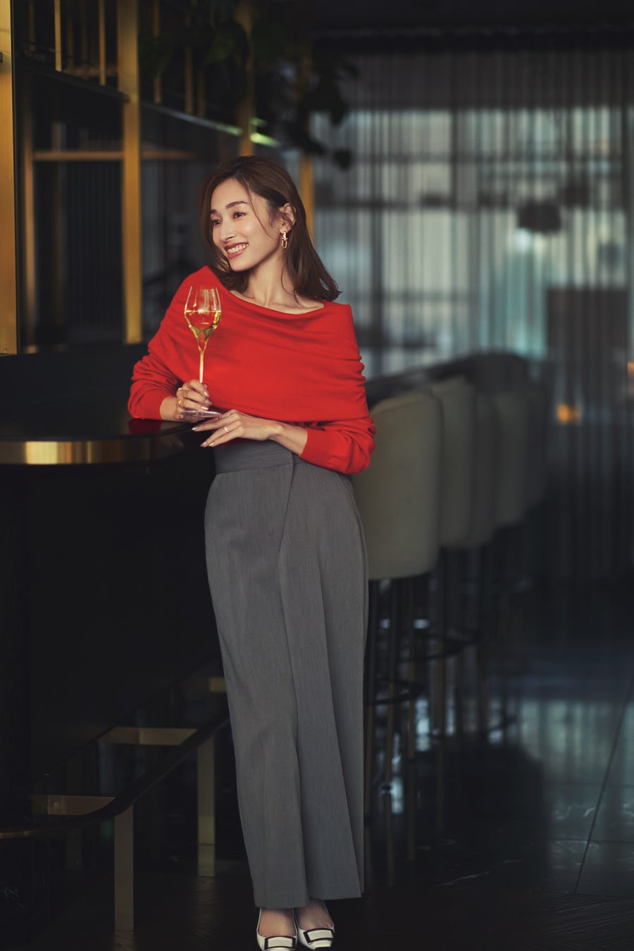 「ホリデーシーズンに映える赤のオフショルダーニットは華やかで女性らしい印象に。
