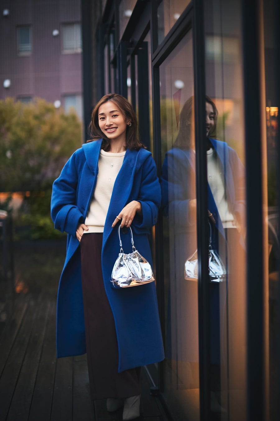 鮮やかなブルーのアウターを合わせたことで、他の人とはかぶらない洗練されたホリデースタイルに。