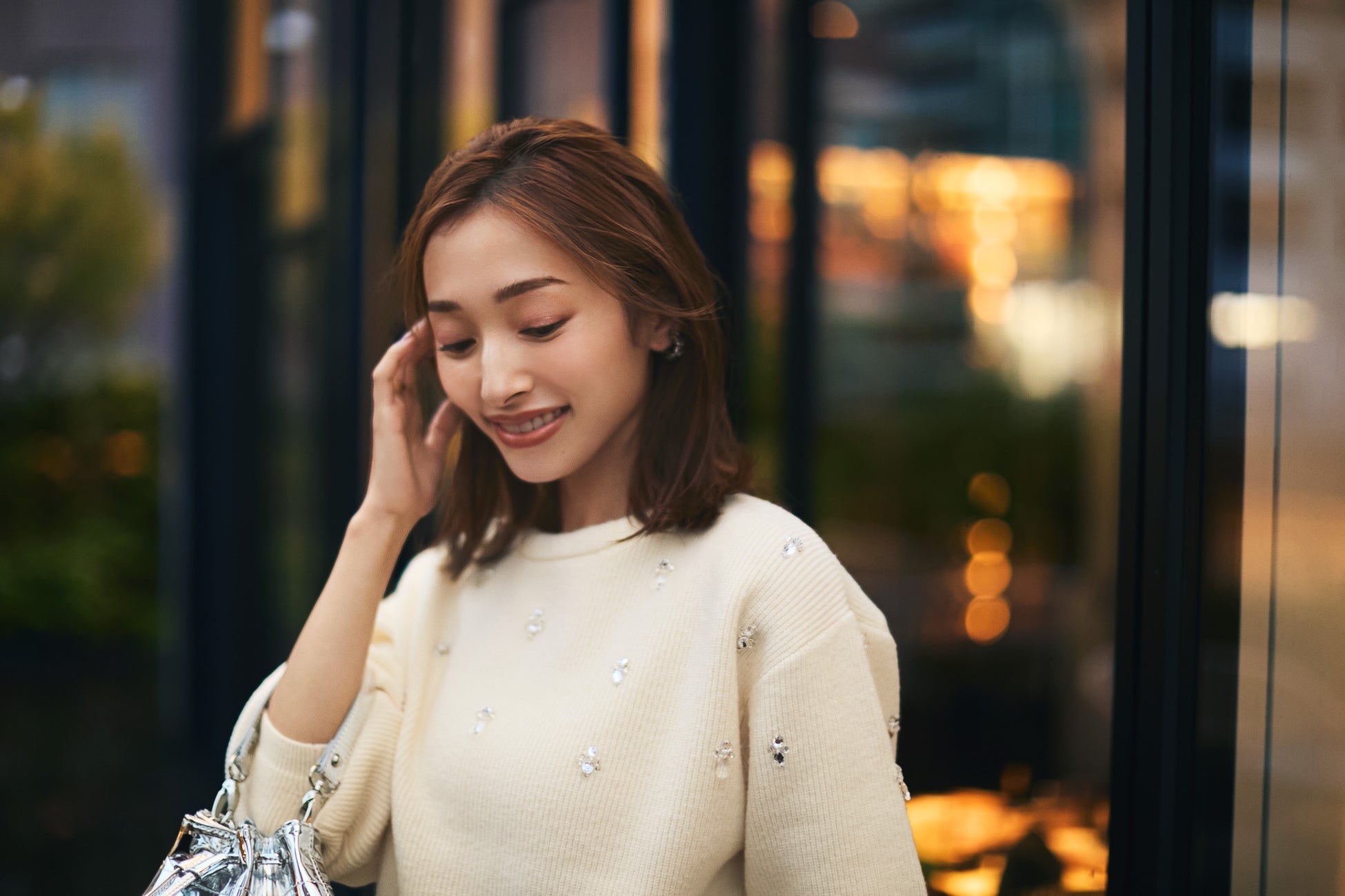 どうしてもダークトーンが増えがちな冬だけど、ニットの煌めきやバッグの光沢で唯一無二の明るいホリデースタイルに。」(吉田さん)