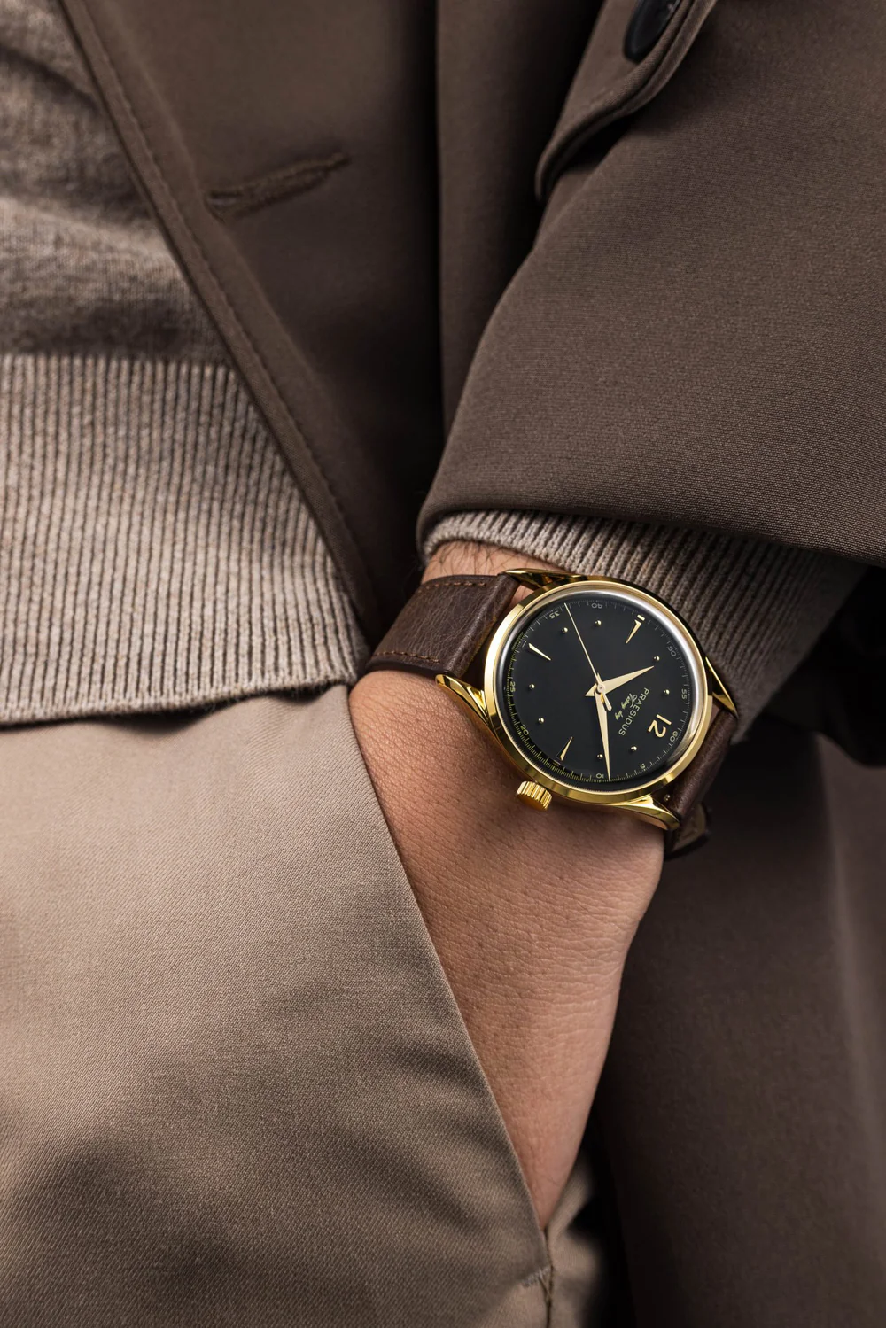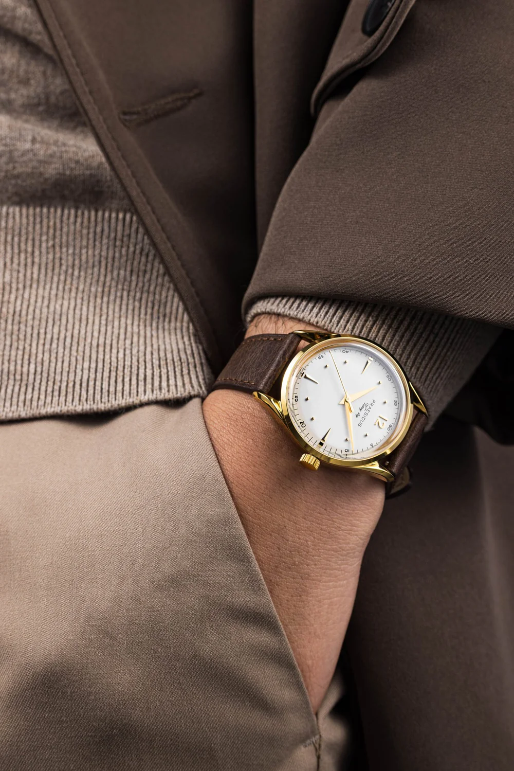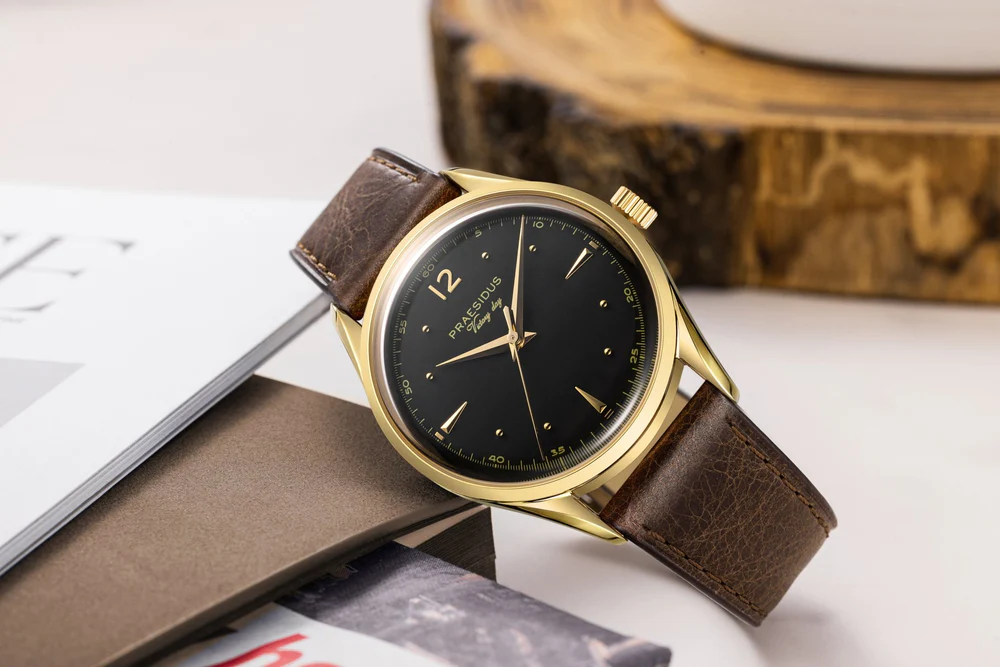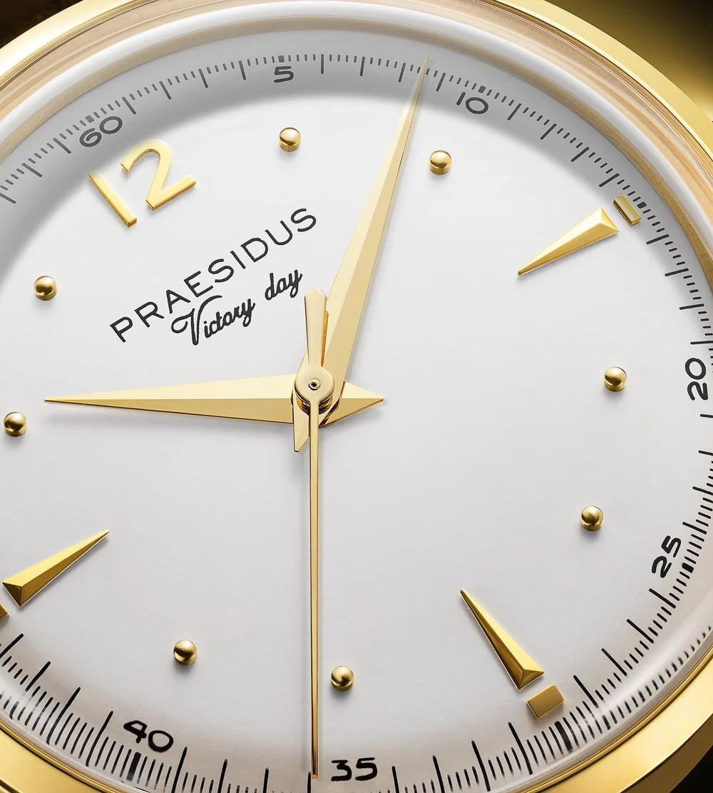 1945年9月2日、戦いの終結とともに訪れたのは、帰還・省察・そして再生の時でした。その歴史的な瞬間から着想を得て誕生した Victory Watch は、戦場の荒々しさを超えて、平和と繁栄の象徴としてのドレスウォッチを体現します。スリムな38mmのケースは、PVDゴールドコーティングを施したステンレススチール製。サファイアクリスタル風防を組み合わせ、普遍的なバランスと繊細なクラフツマンシップを表現しました。剣型の針、ファセット加工されたインデックス、ラッカー仕上げまたはブラッシュ仕上げの文字盤など、伝統的な時計づくりの美学を随所に感じられるデザインです。