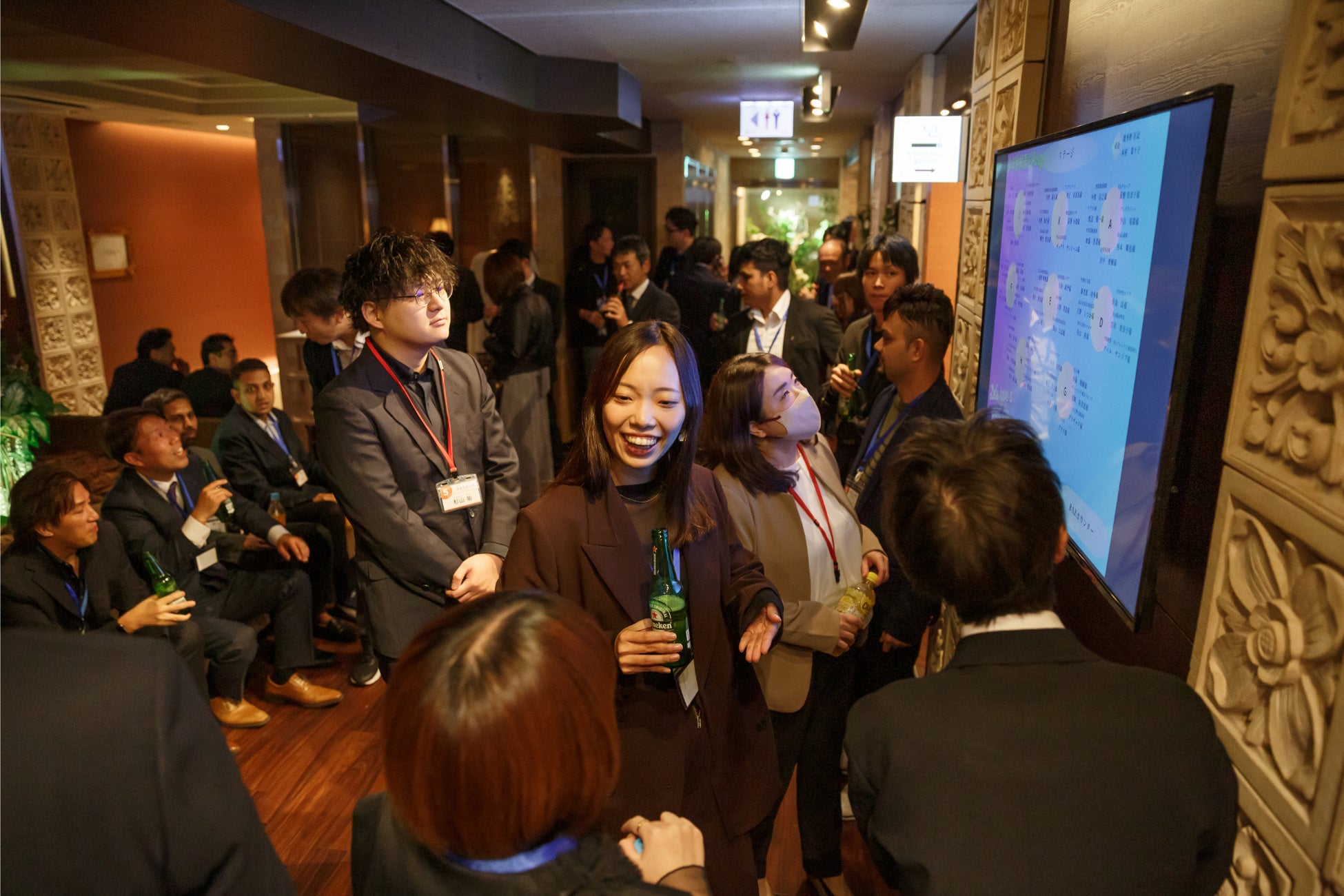 開場前のロビーでは、出席者による「0次会」の乾杯がスタート。久しぶりの再会や新たな出会いを通じた歓談で盛り上がりを見せました。