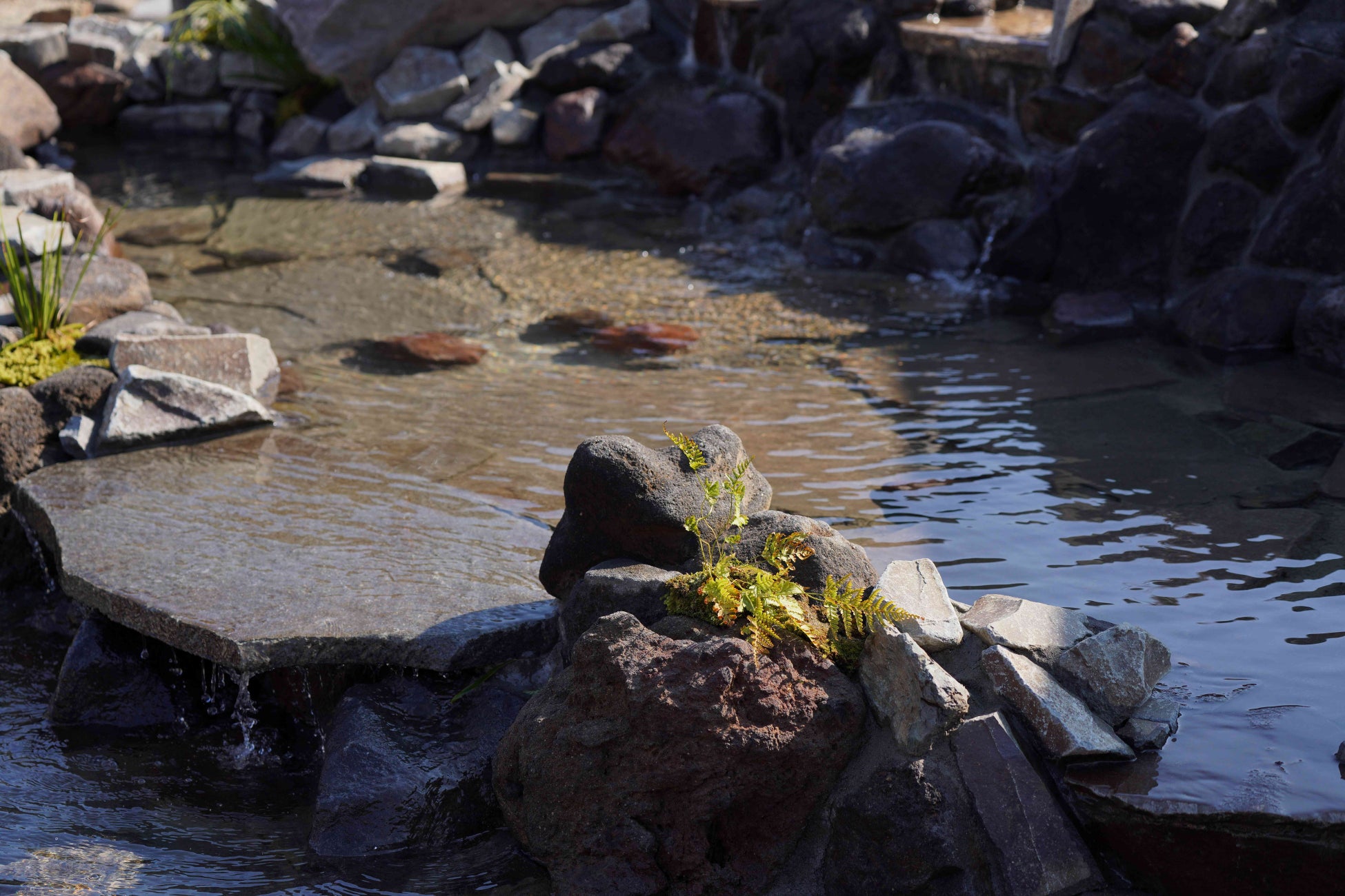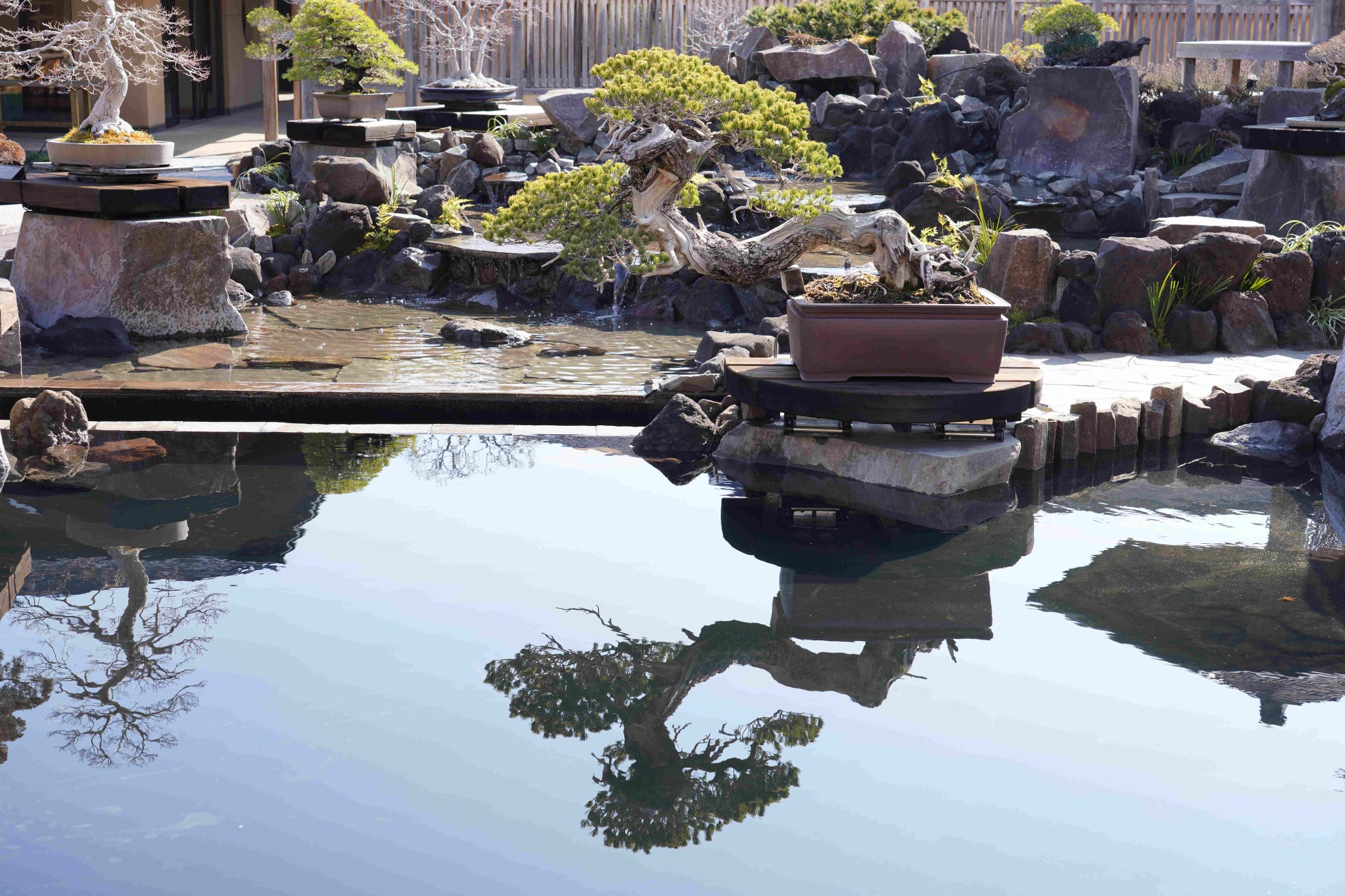 ・池の一部に静水部分を設け、岬の盆栽台に置かれた盆栽を水面に映し出す鏡面池としてデザインしました。