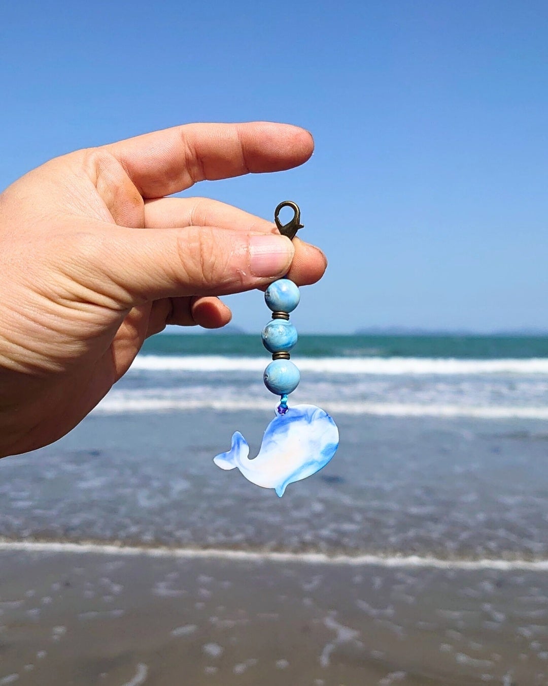 ビーチクリーンや海洋学習を終えた子どもたちが提出した感想文の中に、「キーホルダーが欲しい!」と書いてくれた児童が複数いました。その言葉が、今回のキーホルダー制作のきっかけとなりました。担任教員と一緒にデザインを考え、呼子の里海を象徴するクジラをモチーフに選びました。