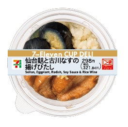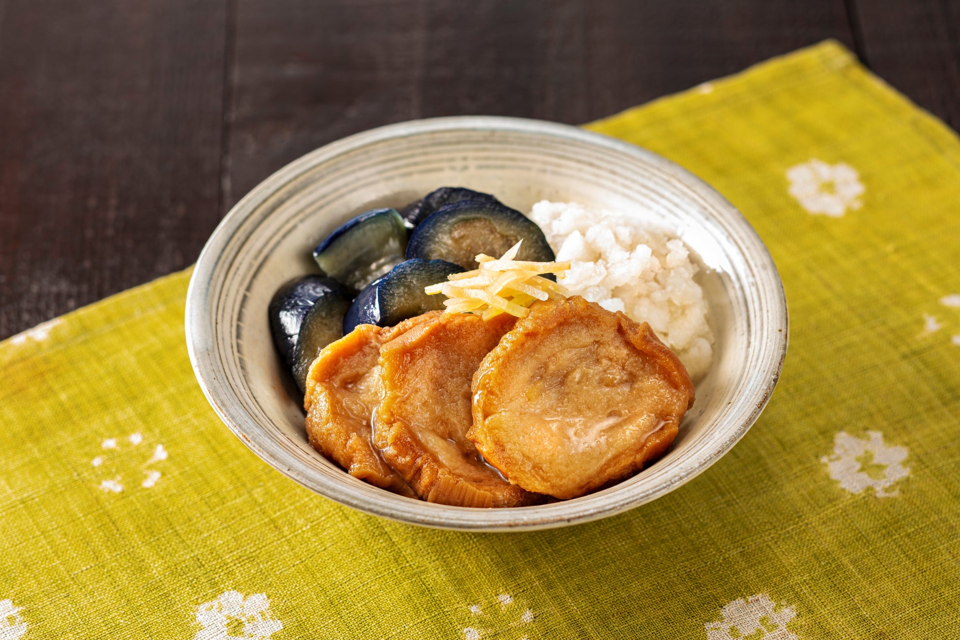 宮城県で馴染みのある仙台麩(あぶら麩)と古川なすを使用したおつまみ惣菜。味が染みた仙台麩は一口嚙むほどに旨味が広がる仕立てに。大根おろし、千切り生姜を組み合わせる事で初夏にぴったりなさっぱりした食べ進みの良い味付けにしております。