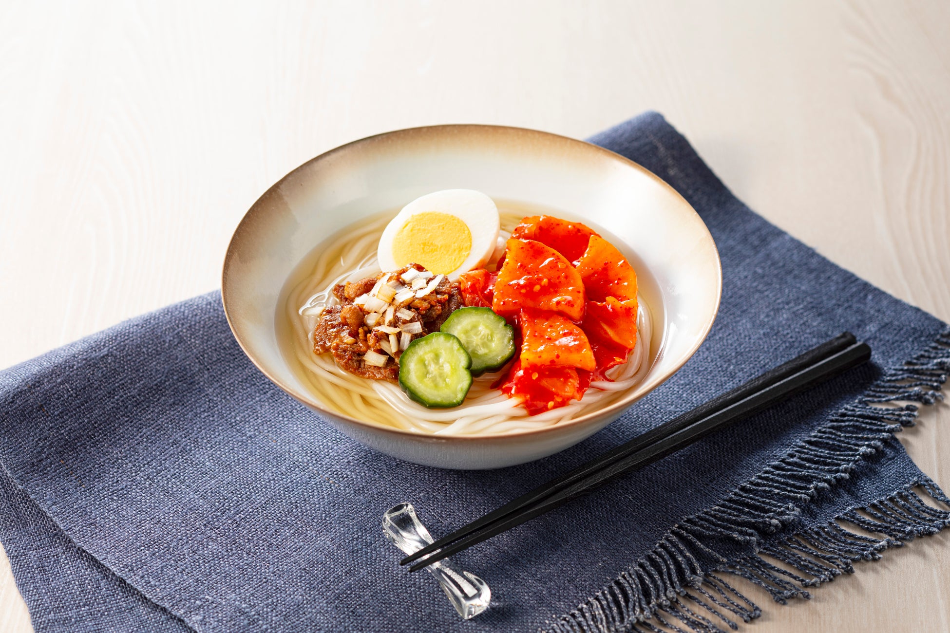 独特のコシと喉越しが自慢の冷麺。牛骨ベースのコクのあるスープは、牛肉の旨味がしっかりと感じられるコクのある仕立て。具材は大根の食感のよいキムチ,玉子,ねぎ,牛肉煮,胡瓜を盛付け。盛岡のソウルフードを、手軽にお楽しみいただけます。
