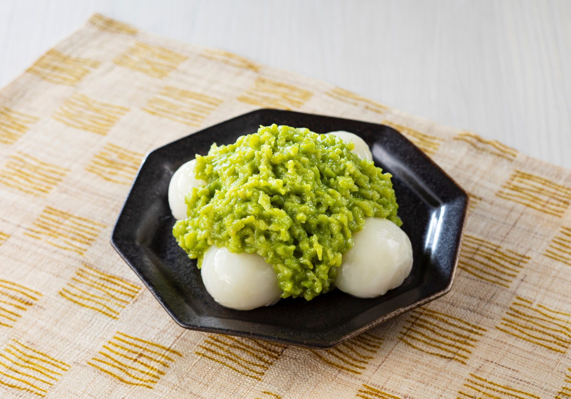 粒感があり、枝豆の風味をしっかり感じられるずんだ餡を団子にたっぷりかけた仕立て。おやつにはもちろん、温かいお茶と一緒に、お楽しみください。
