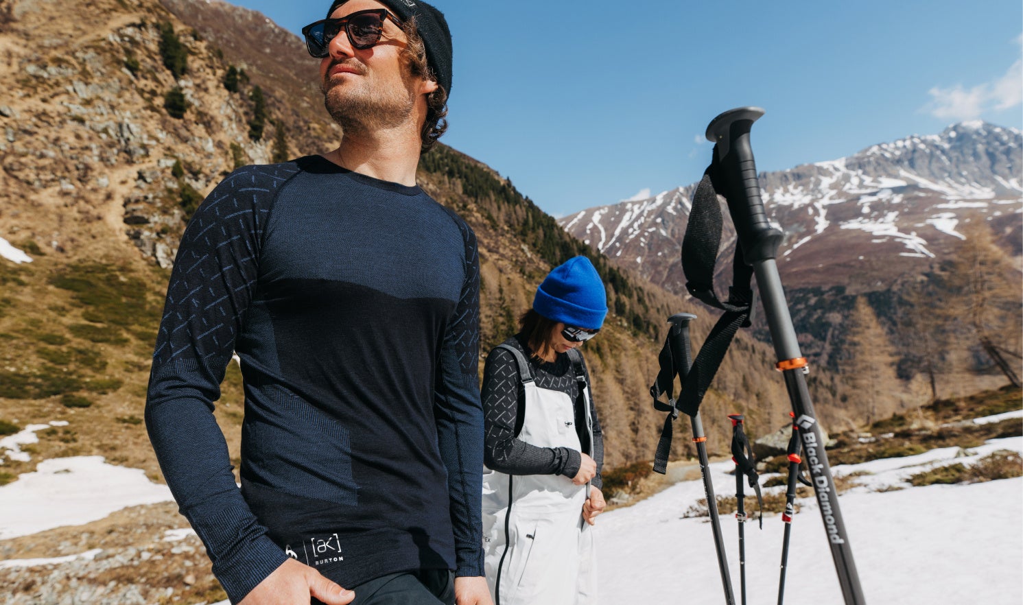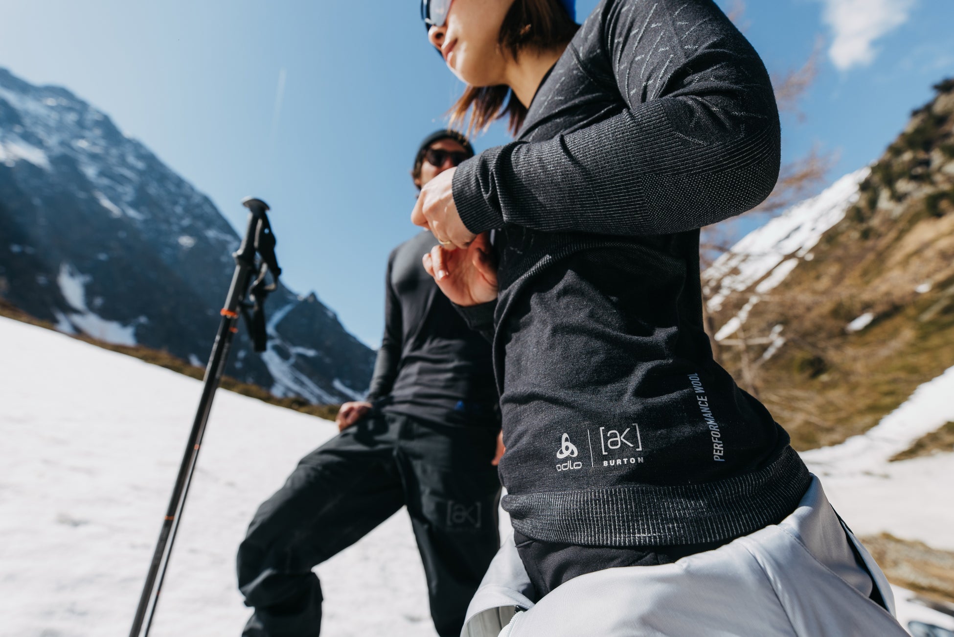 快適なバックカントリースノーボードを実現するために、Burtonはレイヤリングにこだわります。今シーズンは、スイスの高機能スポーツウェアブランドであるOdloとコラボレーションし、ハイパフォーマンスを求めるスノーボーダー向けの[ak]®︎ コレクションにおいて、高い吸湿速乾性と抜群のフィット感を兼ね備えた[ak]®︎ スローカー ファーストレイヤーを販売しています。