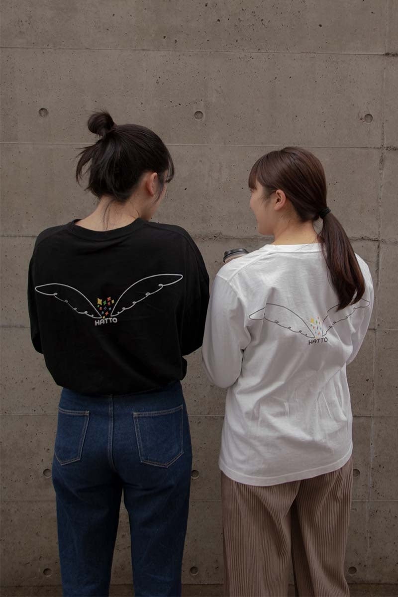 レインボーに塗ったロゴが目立つBOX LOGOは、HATTOの語源となった「ハッと、ひらめく」というコンセプトと、「常識をはみ出そう」という意味を込めました。ロゴマークを組み合わせた勢いのある吹き出しや凹凸プリントでパワフルなイメージを表現しています。HEART LOGOは、言葉遊びから発想し、‟HATTO(ハット)”ロゴを ‟ハート”で囲んでみました。ロゴマークを使ってハートを作ることで、キラキラしたハートに仕上げました。LITTLE WINGは、バックプリントならではのかわいさを追求しました。カフェスタッフが着用しているTシャツは、エプロンをつけると正面が隠れてしまいますが、バックプリントに羽を施すことで、お客様が「あれ、羽が生えてる!?」と思わずハッとするように遊び心を散りばめています。ファッションを楽しむことで、自分らしく好きな場所に羽ばたけるようにとの意味も込めています。HATTO TEEは、カラーバリエーションも6種用意していますので、お好きなタイプを楽しんでいただけたら嬉しいです!