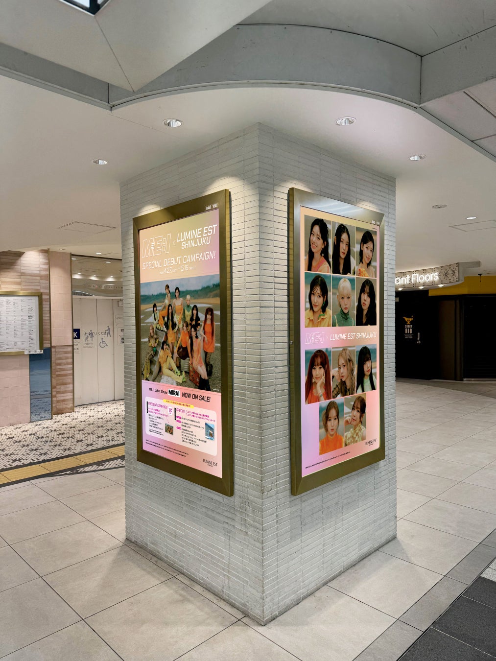 ①ME:Iのビジュアルがルミネエスト新宿館内をジャック。屋外巨大看板のほか、メンバーひとりひとりのポスターも登場!