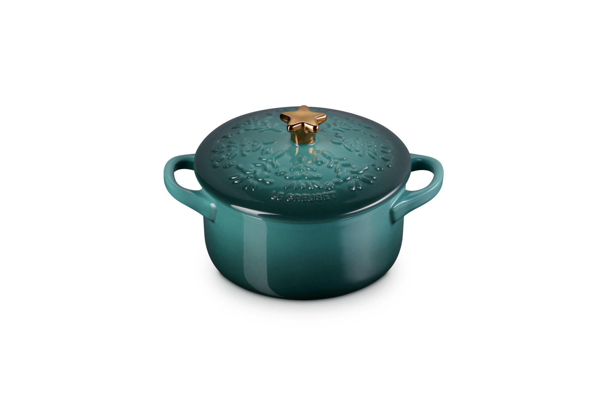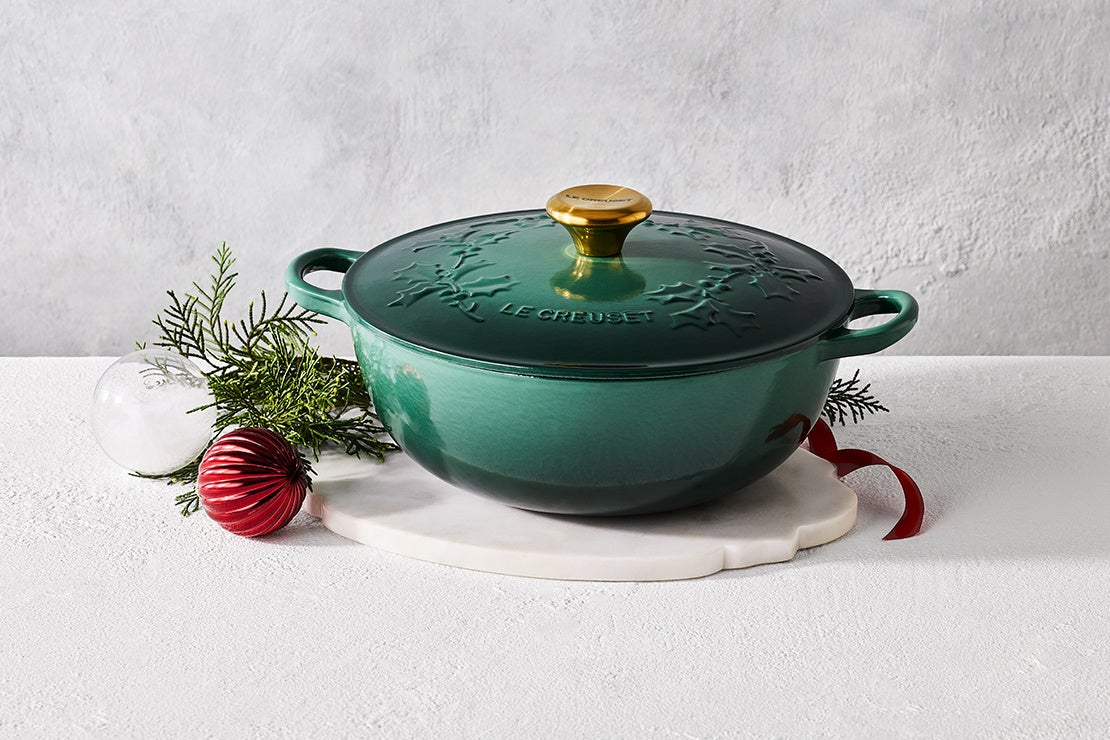 今年のコレクションの主役は、生命力の象徴とも言われるモミの木の緑を、ル・クルーゼのオリジナルカラー「アーティチョーク」でカラーリングした鋳物ホーロー鍋。フタにホーリー(ひいらぎ)のレリーフやゴールドのツマミを施した限定デザインをご用意しました。