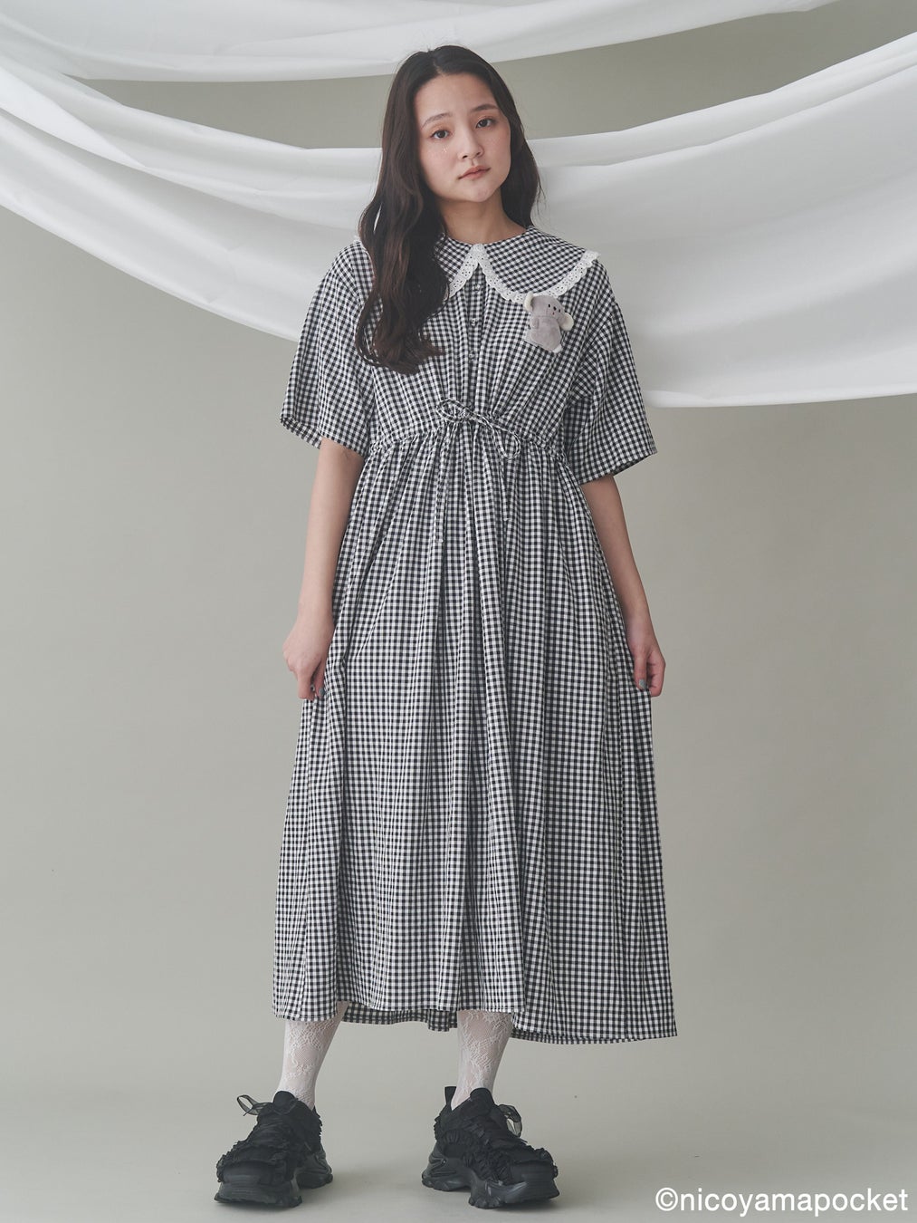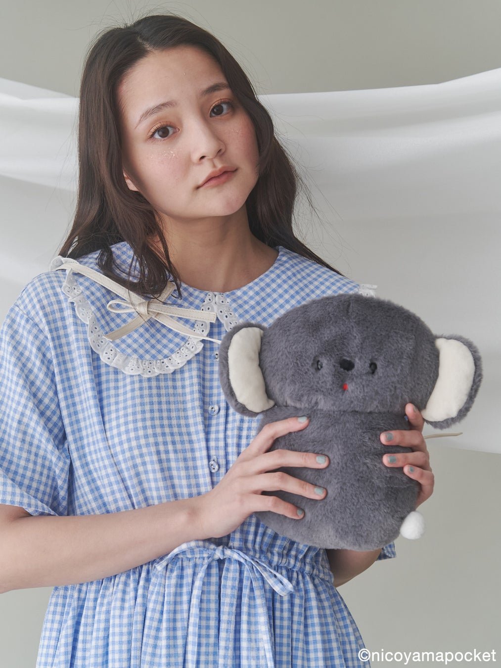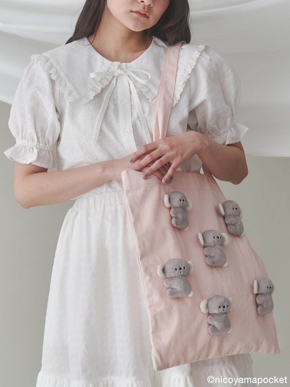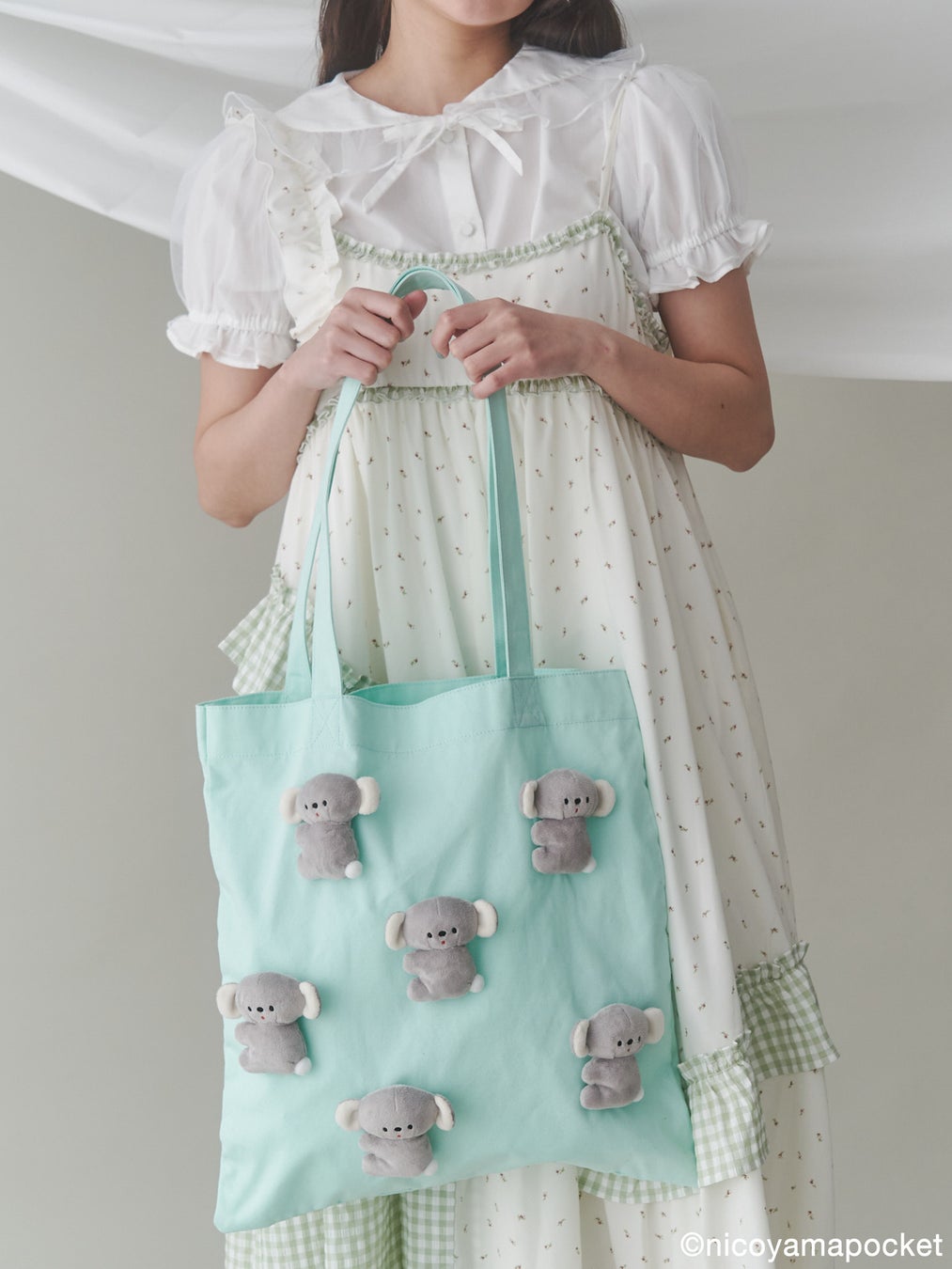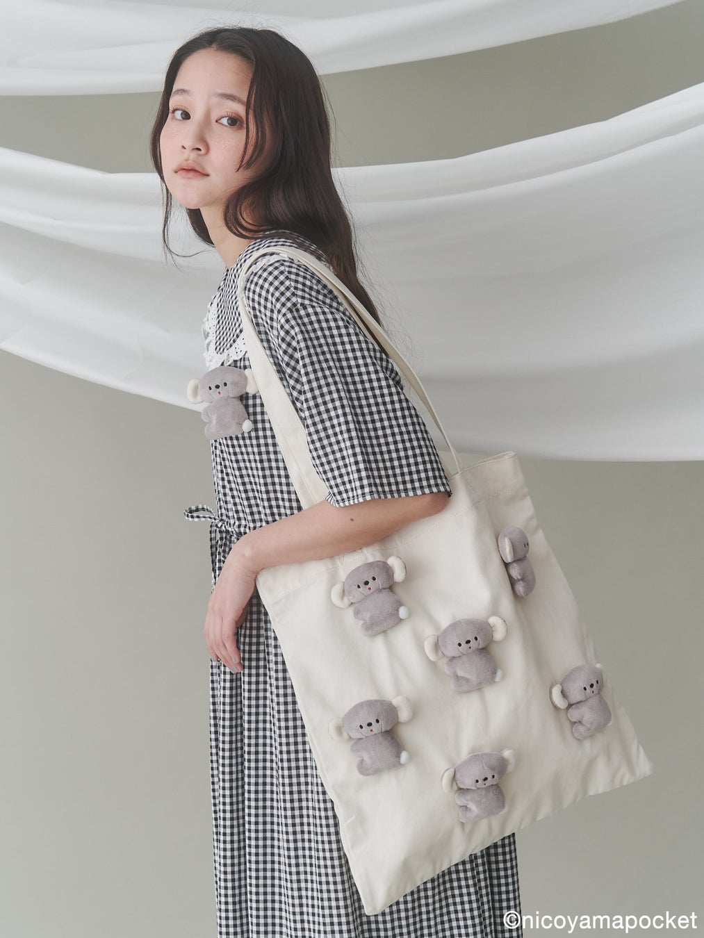 本コラボレーションアイテムでは、にこやまポッケさんの作品である「おすわりコアラ」のぬいぐるみを春らしいギンガムチェックのワンピース、merry jenny定番のぬいぐるみトートバッグ、おすわりコアラをそのまま表現した特別なポシェットに落とし込んだアイテムを展開します。
