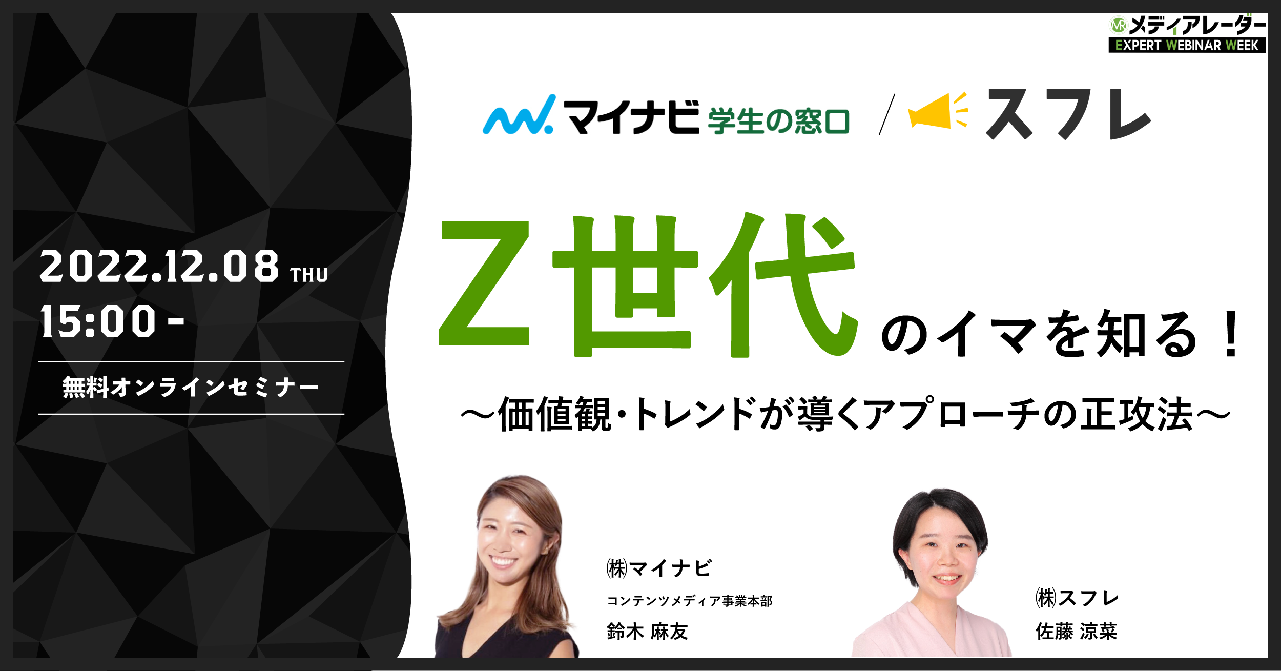 株式会社アイズ(所在地:東京都渋谷区、代表取締役社長:福島範幸)が運営するNo.1*の媒体資料ポータルサイト「メディアレーダー」は、12/8(木)にマーケティングセミナーイベント、第8回 メディアレーダー EXPERT WEBINAR WEEK 2022冬にて、「『Z世代』のイマを知る! ~価値観・トレンドが導くアプローチの正攻法~」を開催します。Z世代マーケティングについての専門家たちが登壇するオンラインセミナーで、参加申し込みは無料です。