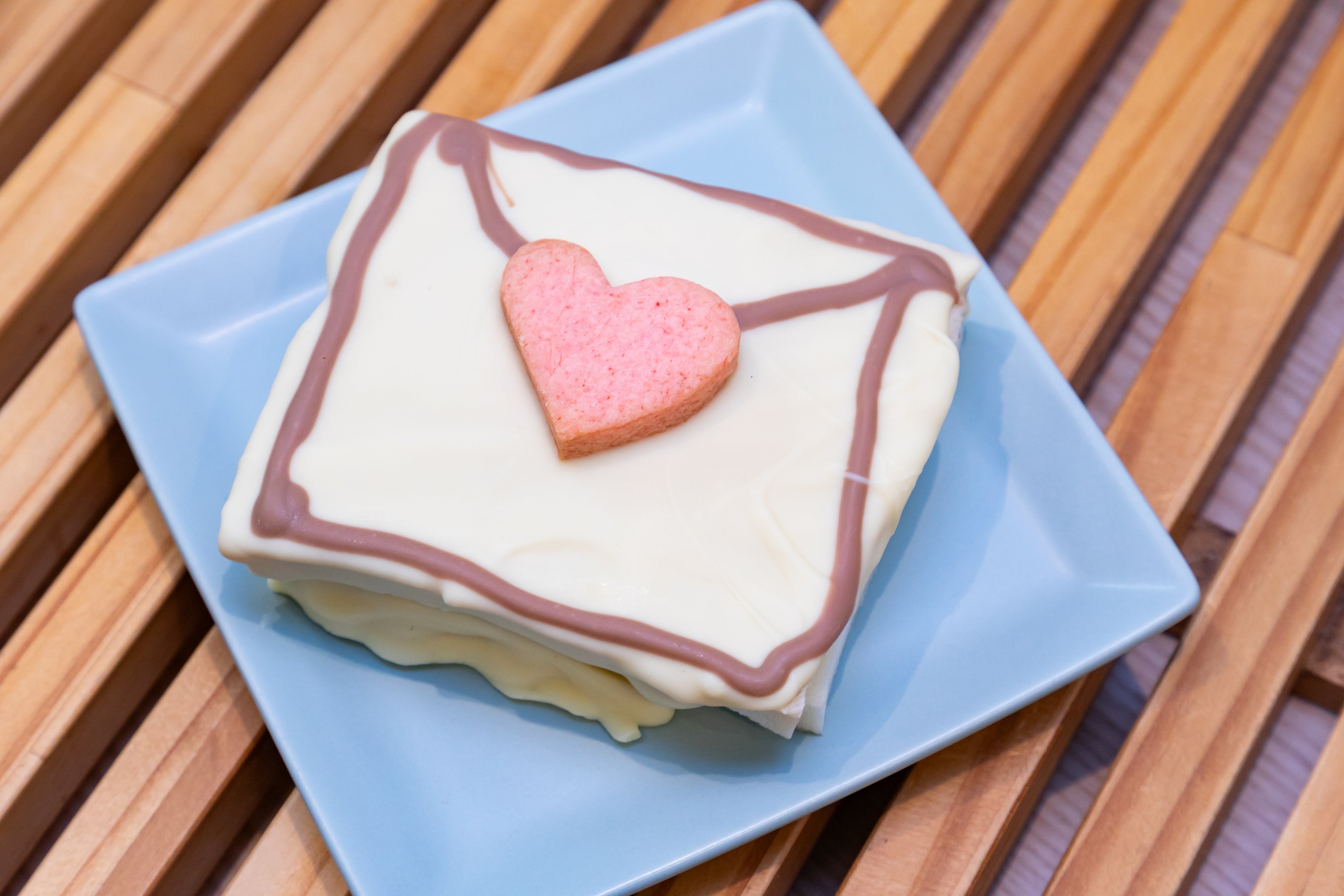 駅員さんのイメージを忠実に再現しました。季節限定の桜あんを、あんこ屋さんから直接仕入れて使用。ラブレターの形に仕上げるため、食パン型を一工夫しました。仕上げに桜色のクッキーをのせ、春の訪れを感じる見た目と味わいです。心温まる一口をお届けします。ぜひ、ご賞味ください。