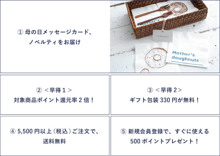 今年の母の日は、5月8日(日)。お弁当作りや掃除、育児など、毎日の暮らしを支えてくれているお母さんに、日頃の感謝を込めて、母の日に贈りものをしませんか。「ありがとう」の気持ちを伝える、とっておきの母の日ギフトやお買いもの特典をはじめ、母の日特別企画としてレシピ特集「栗原はるみの母ドーナツ」もご紹介します。