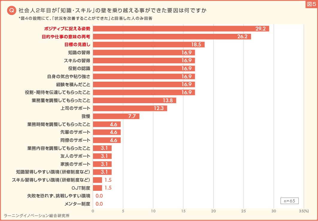 社会人2年目がその壁を乗り越えることができた要因については、「ポジティブに捉える姿勢」が29.2%と最大の割合となりました。次に、「目的や仕事の意味の再考」が26.2%、「目標の見直し」が18.5%と続きました。社会人2年目では、仕事への姿勢や目的の再考など、意識に関する項目が高い割合となりました。(図5)