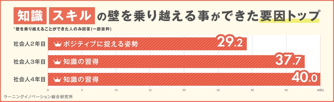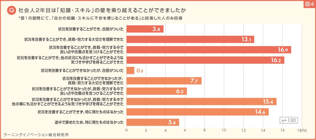 ここからは、2年目、3年目、4年目で最大の割合となった『知識・スキルへの不安』の壁について、果たして彼らがその壁を乗り越えることができたのか、また、乗り越えた場合はその要因が何だったのかを、各年次に質問しました。