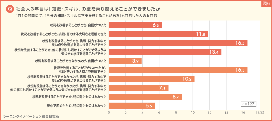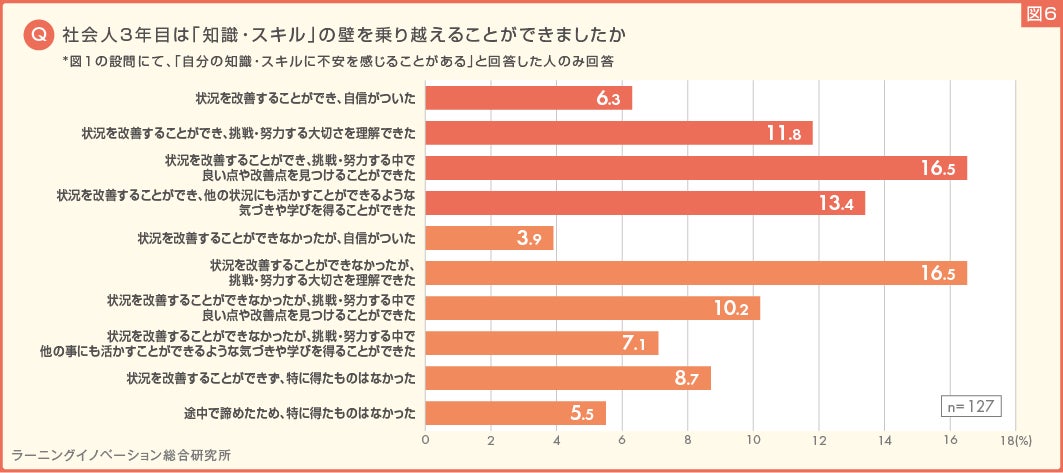 続いて、社会人3年目が『知識・スキルへの不安』の壁を乗り越えることができたかどうかに関しては、1位は「状況を改善することができ、挑戦・努力する中で良い点や改善点を見つけることができた」「状況を改善することができなかったが、挑戦・努力する大切さを理解できた」が16.5%と同率になりました。次に「状況を改善することができ、他の状況にも活かすことができるような気づきや学びを得ることができた」が13.4%と続きました。(図6)
