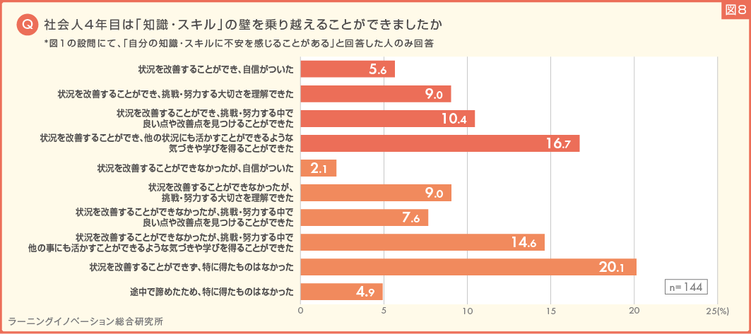 最後に、社会人4年目が『知識・スキルへの不安』の壁を乗り越えることができたかに関しては、「状況を改善することができず、特に得たものはなかった」の回答が20.1%と最大の割合に。次に、「状況を改善することができ、他の状況にも活かすことができるような気づきや学びを得ることができた」が16.7%、3位に「状況を改善することができなかったが、挑戦・努力する中で他の事にも活かすことができるような気づきや学びを得ることができた」が14.6%となりました。(図8)