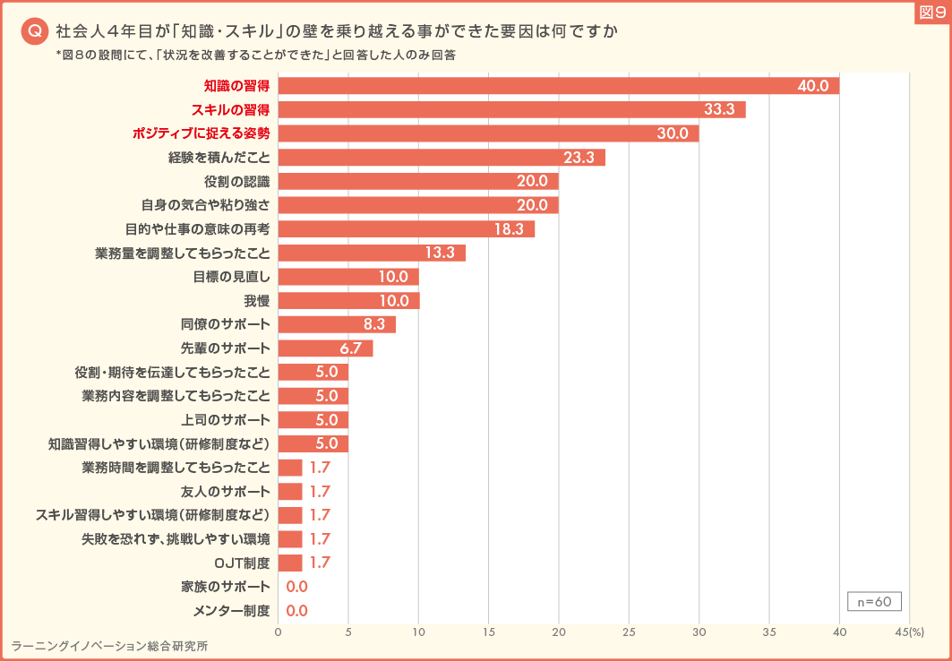 そして、社会人4年目が壁を乗り越えることができた要因は何かを質問したところ、「知識の習得」が最も高く、その割合は40.0%に達しました。次に「スキルの習得」が33.3%、「ポジティブに捉える姿勢」が30.0%となりました。(図9)